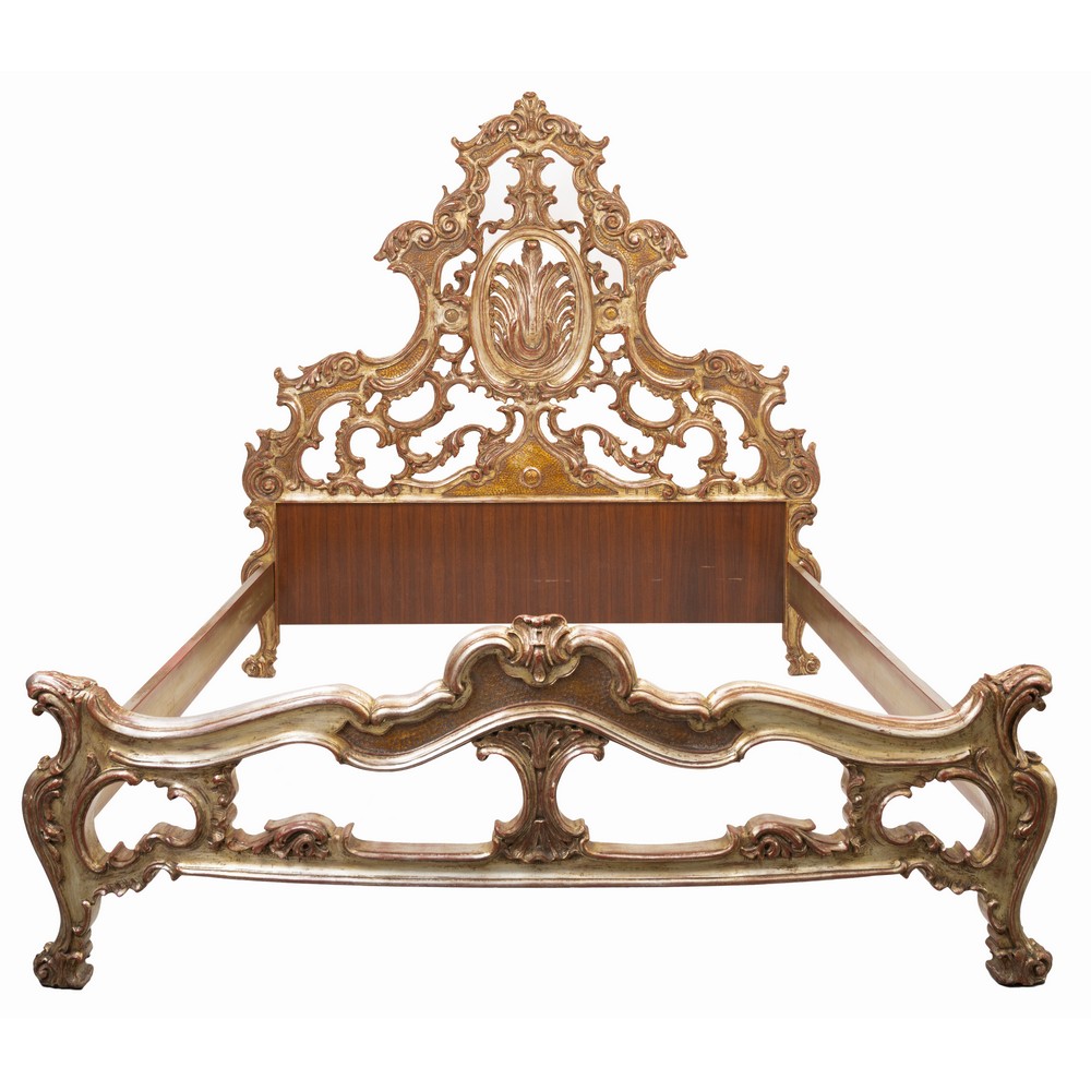 LETTO di gusto barocco in legno dorato riccamente scolpito.