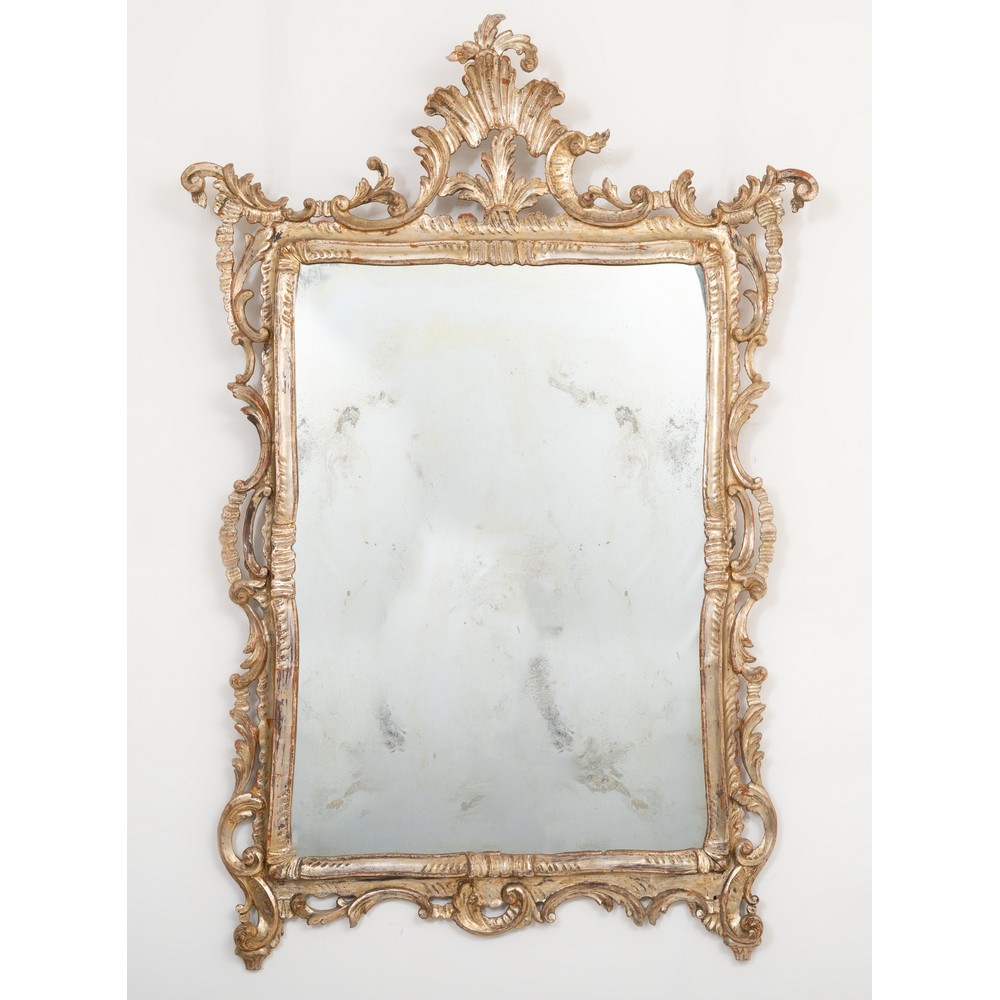 SPECCHIERA di gusto barocco in legno intagliato ed argentato.