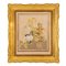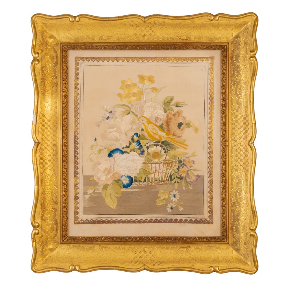 CORNICE a vassoio in legno dorato a d oro zecchino, all'interno presenta tessuto in seta ricamato raffigurante natura morta (usure).