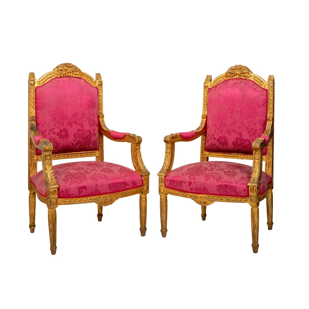 in legno dorato con tappezzeria damascata nei toni del rosso nella seduta e nella spalliera.