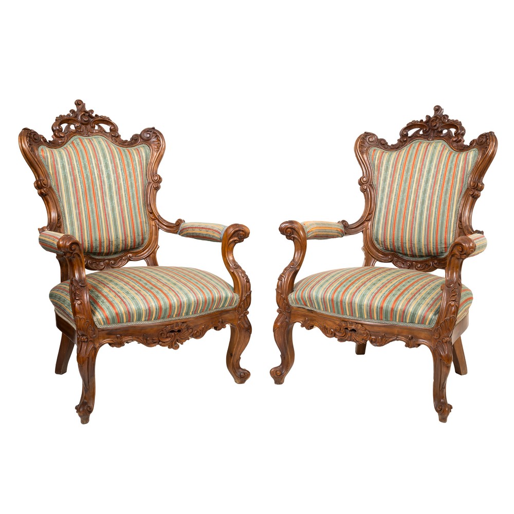 COPPIA DI POLTRONE Stile Luigi Filippo in legno di noce con seduta e spalliera in tessuto.