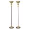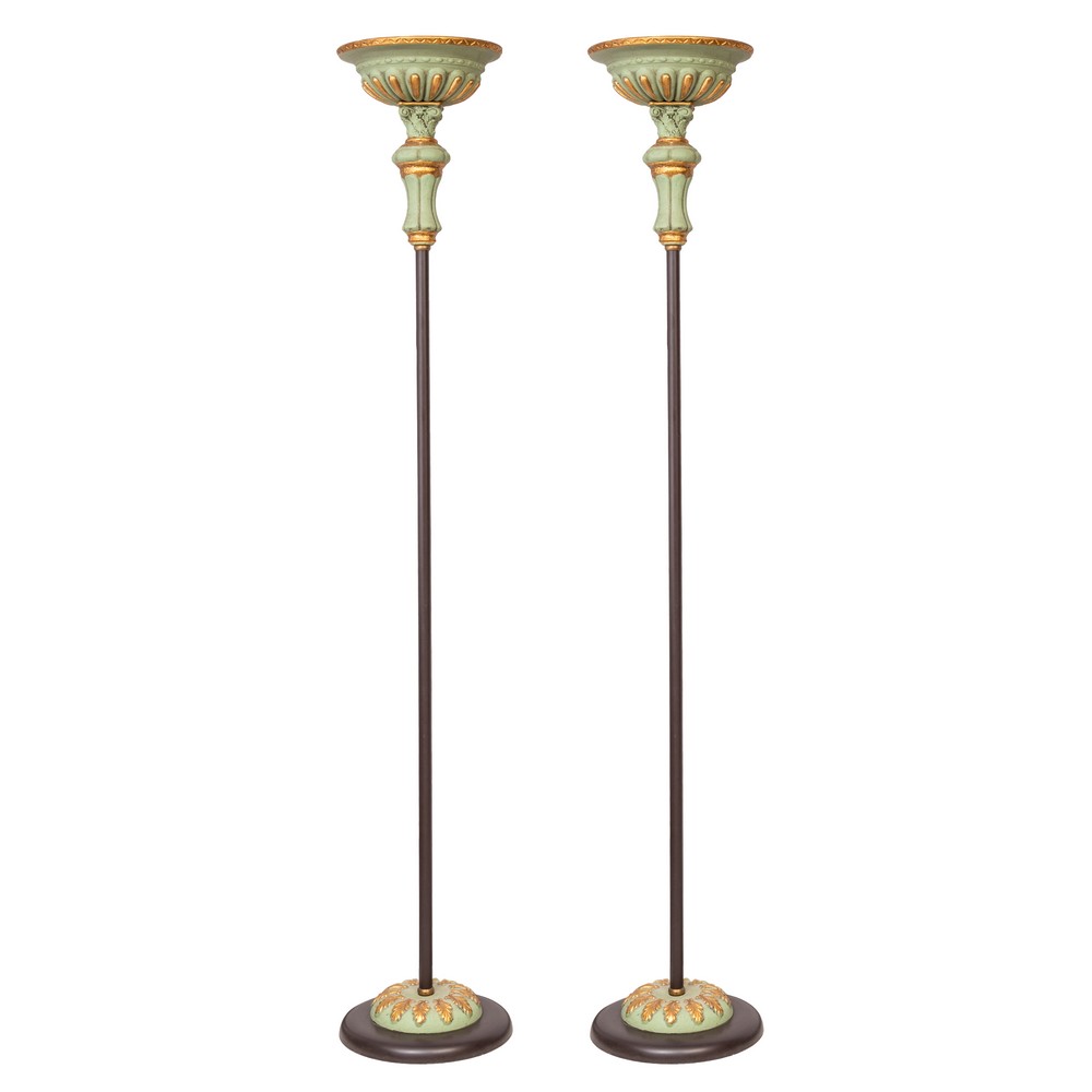 COPPIA DI LAMPADE DA TERRA con fusto in legno e terracotta laccata nei toni del verde e dorato.