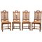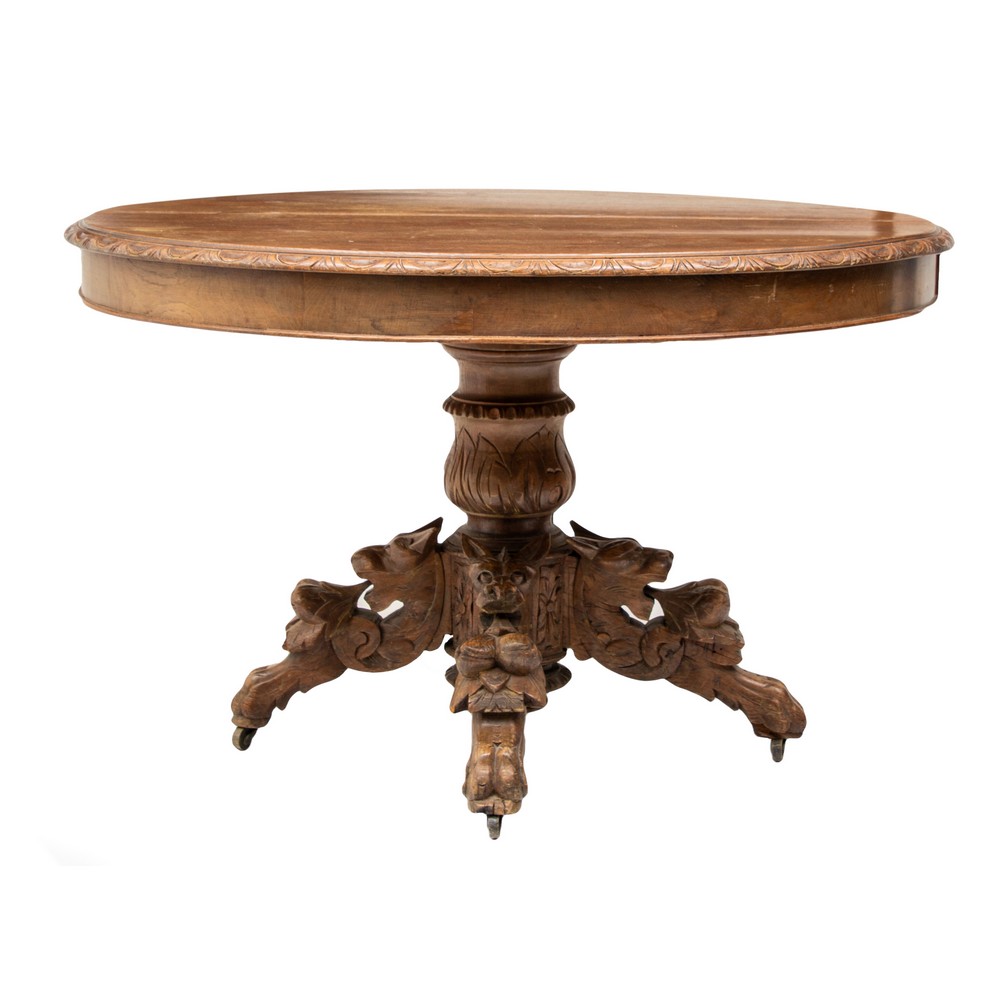 TAVOLO allungabile e quattro sedie in legno di rovere riccamente intagliati (usure e mancanze nelle sedie).