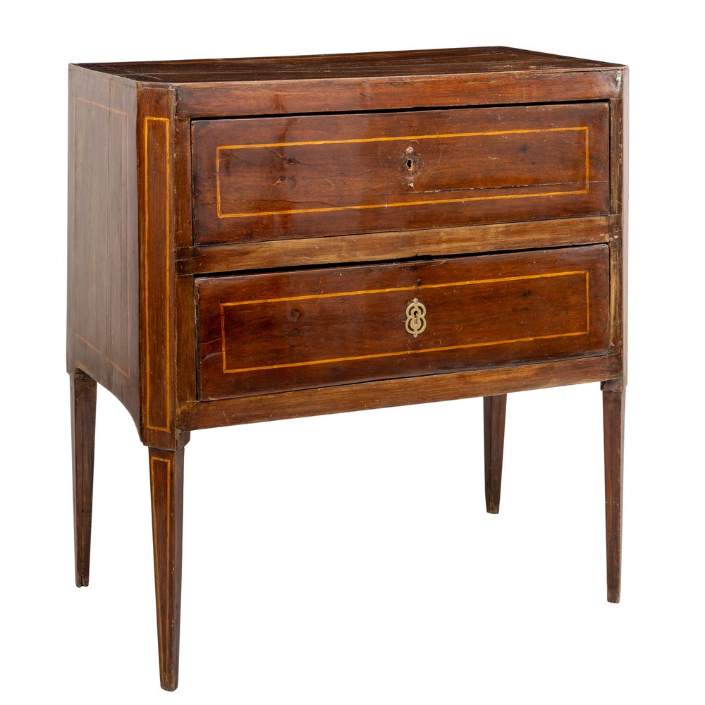 Cassettone stile Luigi XVI a due cassetti in legno di noce e perfili in bosso.