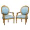 in legno dorato con tappezzeria damascata nei toni del celeste nella seduta e nella spalliera.