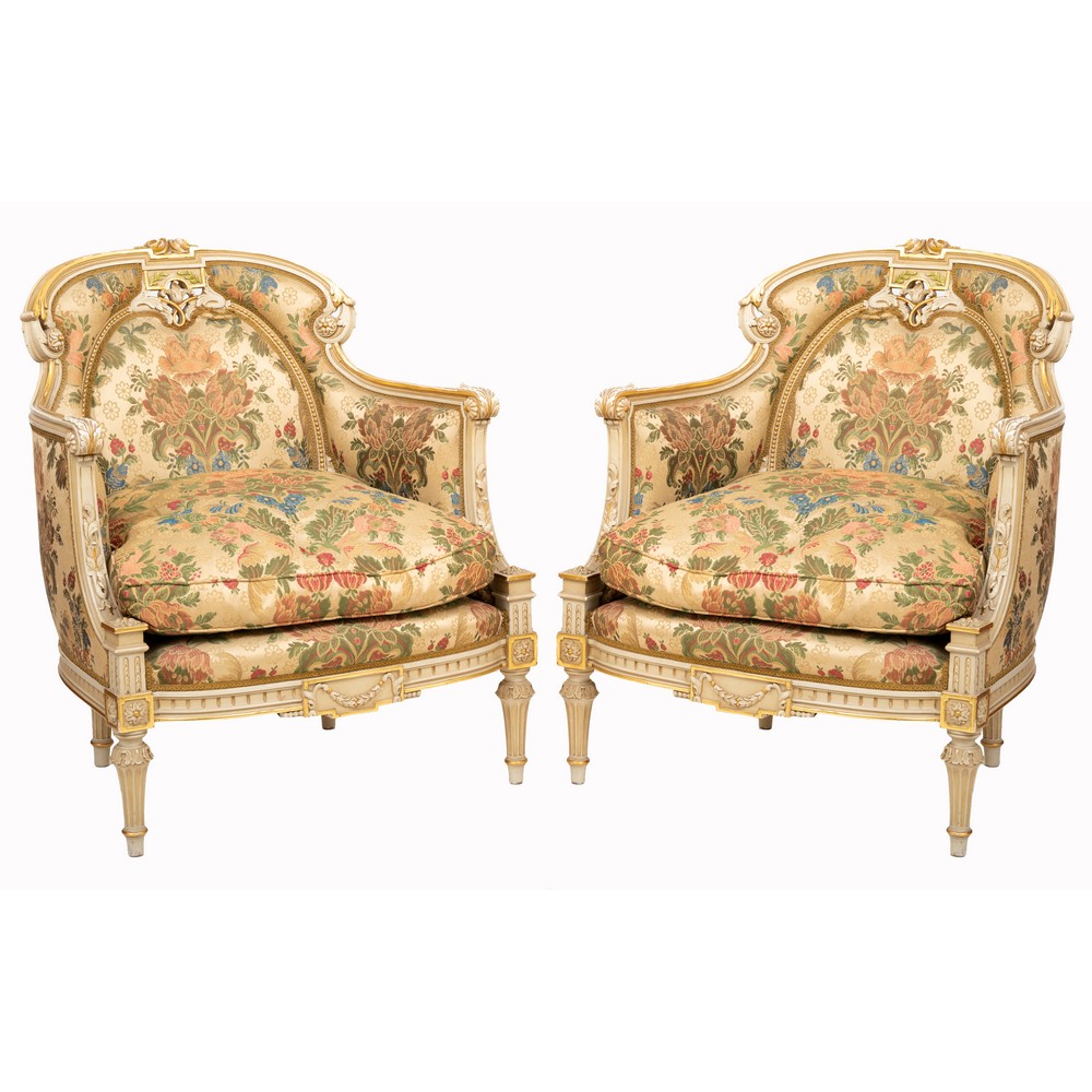 COPPIA DI POLTRONE a pozzetto stile Luigi XVI in legno laccato e in parte dorato, seduta e spalliera imbottita e rivestita in tessuto a motivo floreale.