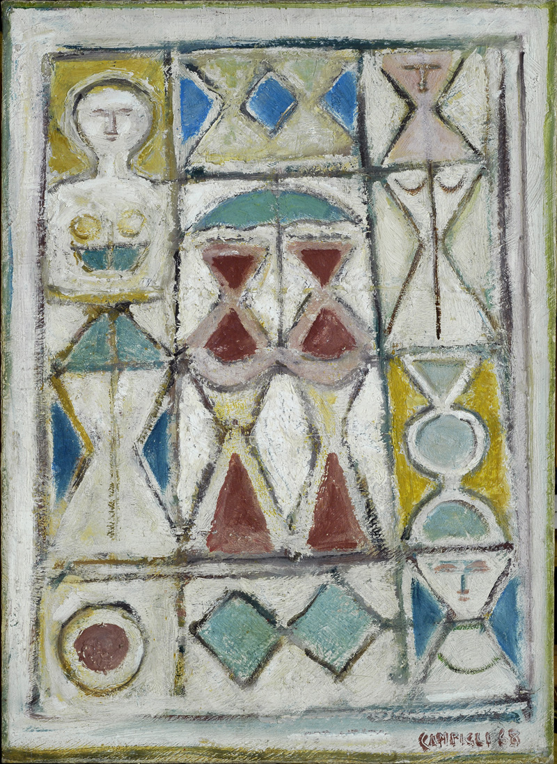 Massimo Campigli (Berlino, 1895 - St. Tropez, 1971) COMPOSIZIONE (ORNAMENTO PER TAPPETO), 1968 Olio su tela, cm. 60x43 Firma in basso a destra. Sul verso: firma, data e titolo; timbro Zanini, Roma; La Tavolozza, Roma. Bibliografia: Catalogo Umeda Gallery fig.19 Osaka 1968; Catalogo Medea N.°27 Tav. 39, Milano 1970; “Antologia” Galleria La Bussola giugno 1971; “Omaggio a M. Campigli” Galleria Medea Catalogo N.°40 Tav.32 Cortina D’Ampezzo 1971; “Omaggio a M. Campigli” Galleria Internazionale tav.16 Montecatini Terme 1972; Esposizioni: Umeda Gallery Osaka 1968; Galleria Medea 23 ottobre 1970, Milano; Galleria Medea 13/26 agosto Cortina D’Ampezzo 1971, Galleria Dimensione, Roma 1972; “Omaggio a Massimo Campigli” Galleria Internazionale Montecatini Terme 20 maggio 10 giugno 1972. L’opera verrà inserita nel “Catalogo Generale delle opere di M. Campigli” di prossima pubblicazione.