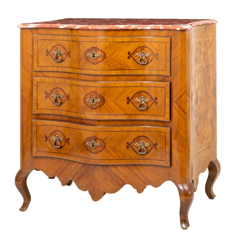CASSETTONE stile Luigi XIV a tre cassetti in noce e radica di tuja, piano in marmo rosso di Francia.