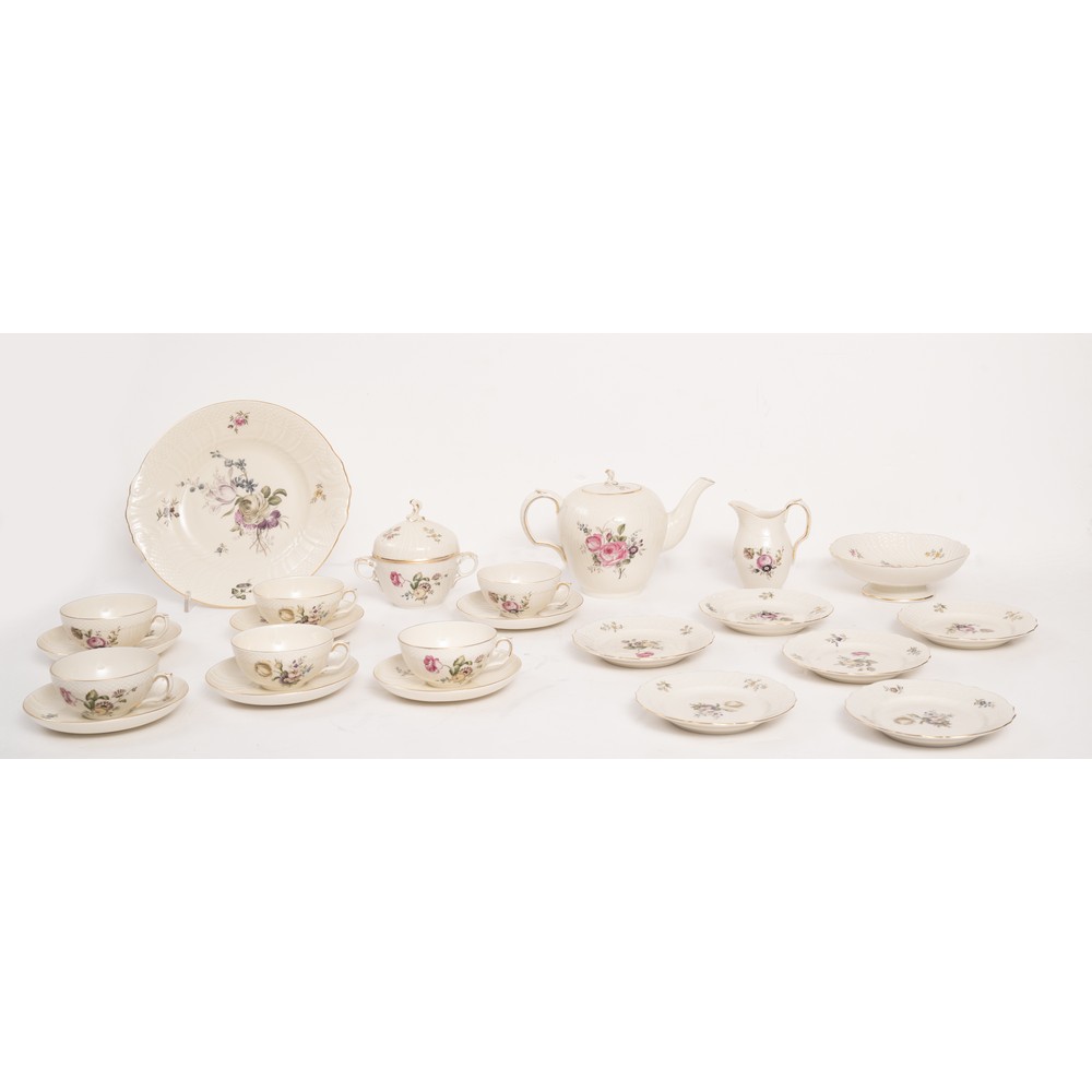 SERVIZIO da the in porcellana bianca Royal Copenhagen composto da theiera, lattiera, zuccheriera, 6 tazze con piattini, piatto tondo da portata, 6 piatti dolce ed alzatina con decori a motivo floreale e fogliaceo e lumeggiature in oro.