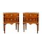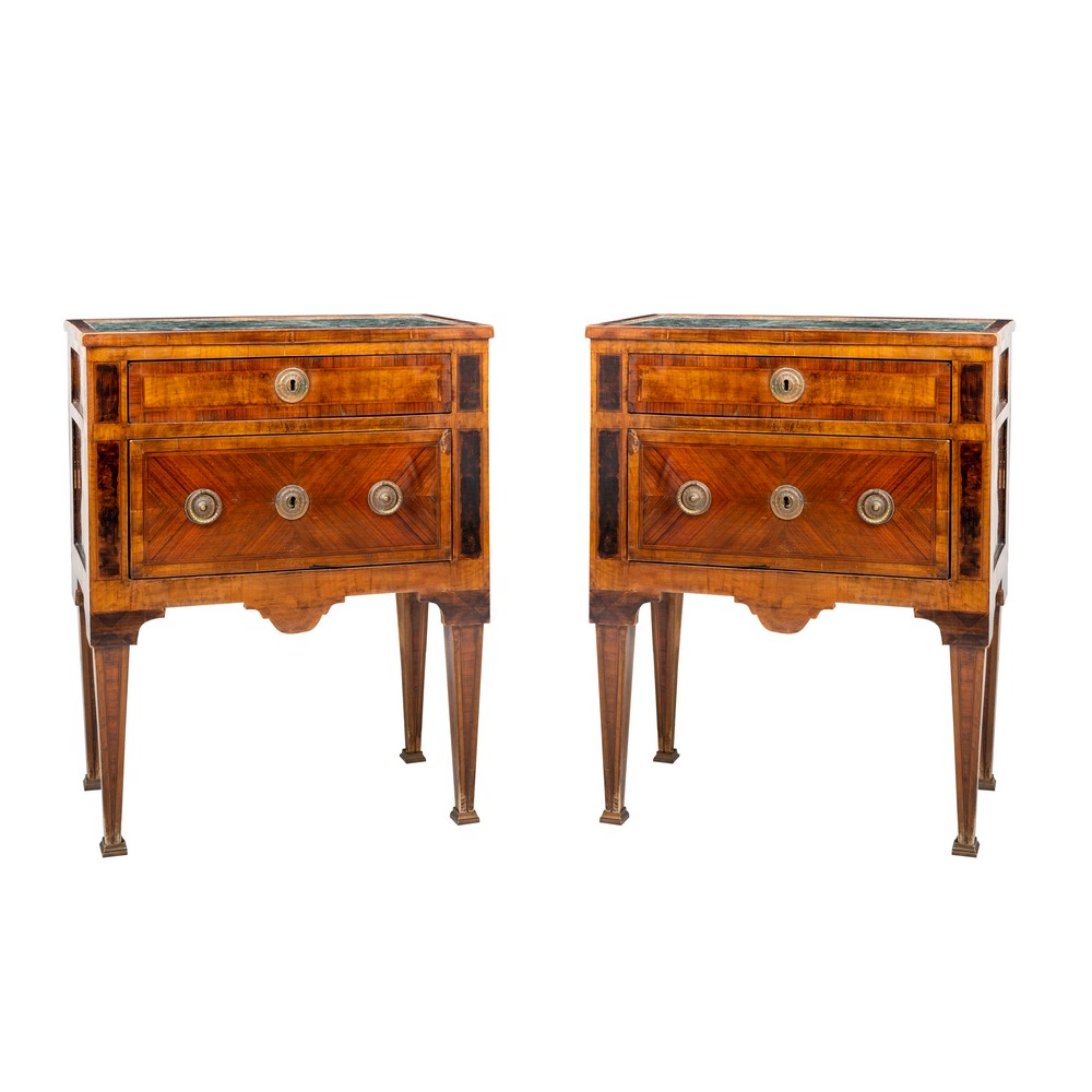 COPPIA DI COMODINI Stile Luigi XVI a due cassetti in legno di ebano e radica di tuja, piano in marmo verde delle alpi.