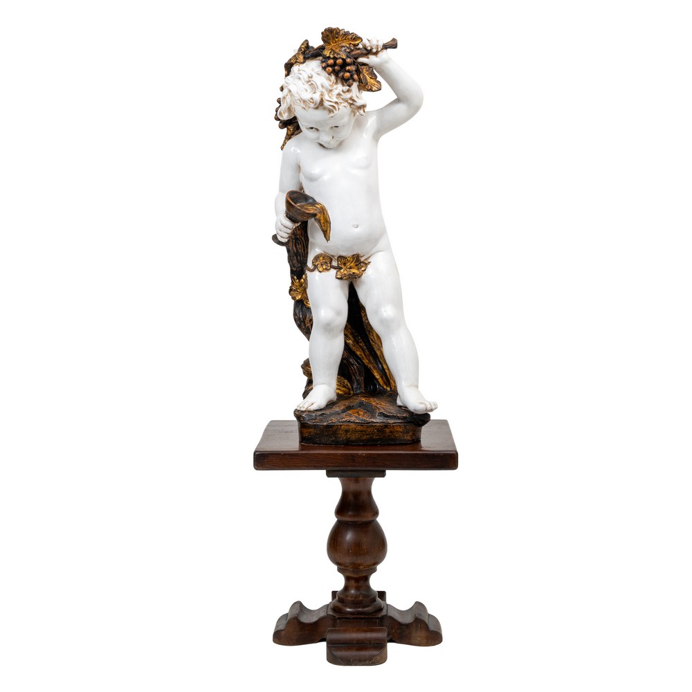 SCULTURA raffigurante Bacco in ceramica smaltata e decorata con base in legno.