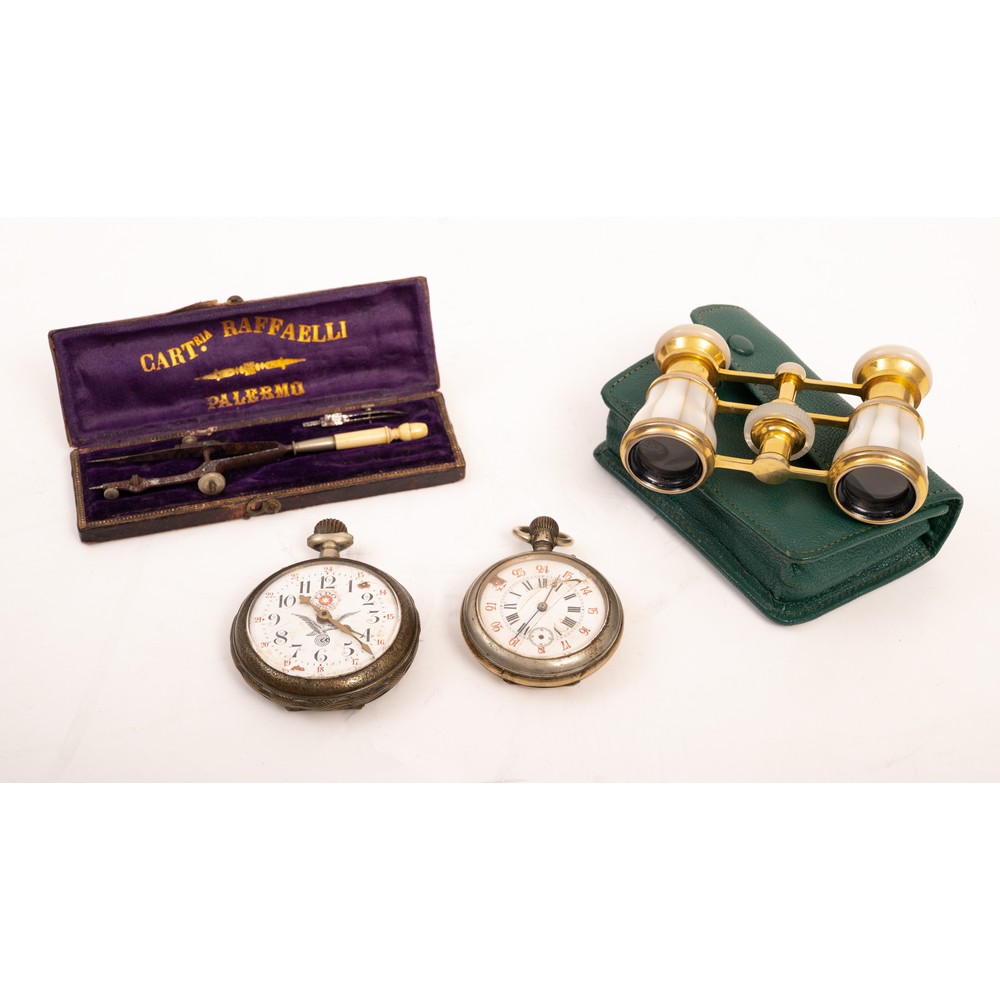 Binocolo da teatro Altex Paris in ottone dorato e madreperla, entro custodia in pelle verde, compasso entro custodia, due orologi da tasca da revisionare in metallo con quadranti smaltati (usure, rotture).