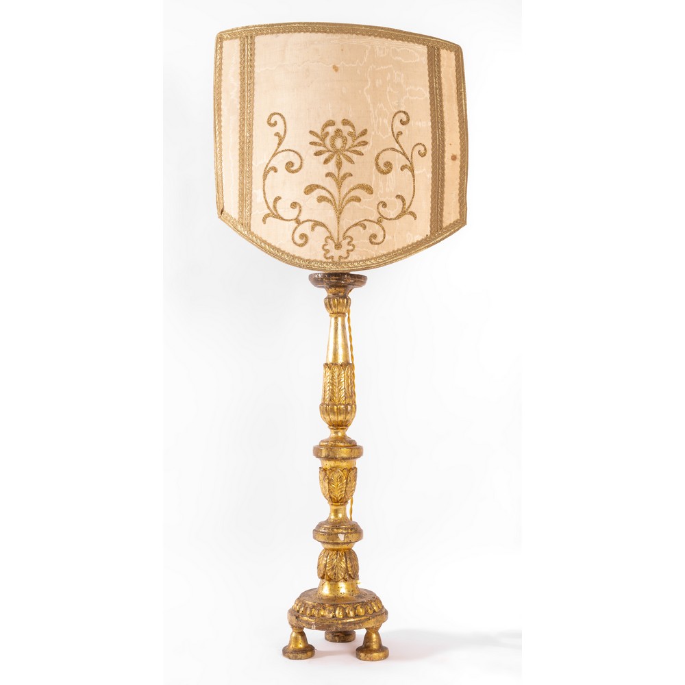 Torcere Luigi XVI in legno dorato ad argento a mecca trasformato in lume, con ventola lavorata a filo d'oro.