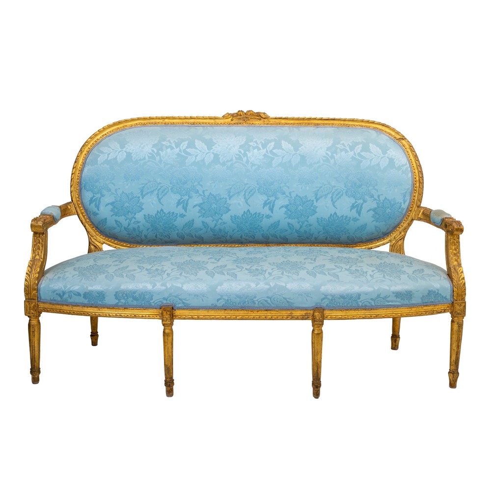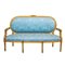 in legno dorato con tappezzeria damascata nei toni del celeste nella seduta e nella spalliera.