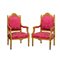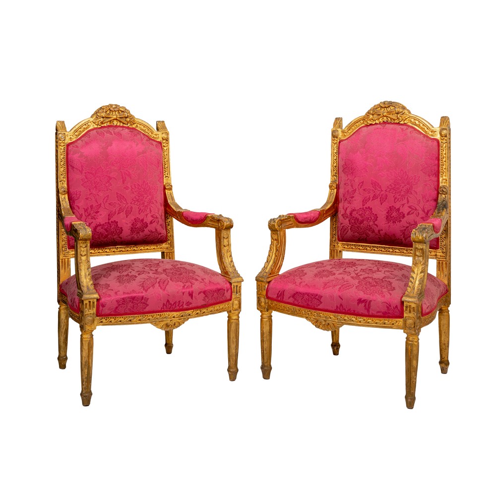 in legno dorato con tappezzeria damascata nei toni del rosso nella seduta e nella spalliera.