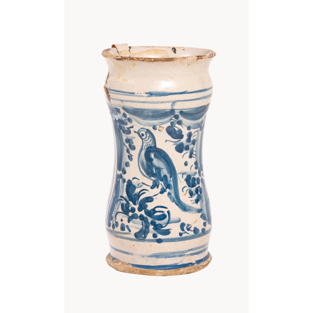 ALBARELLO in ceramica smaltata e decorata nei toni del blu con decorazione raffigurante "Volatile" (restauro e mancanze).