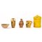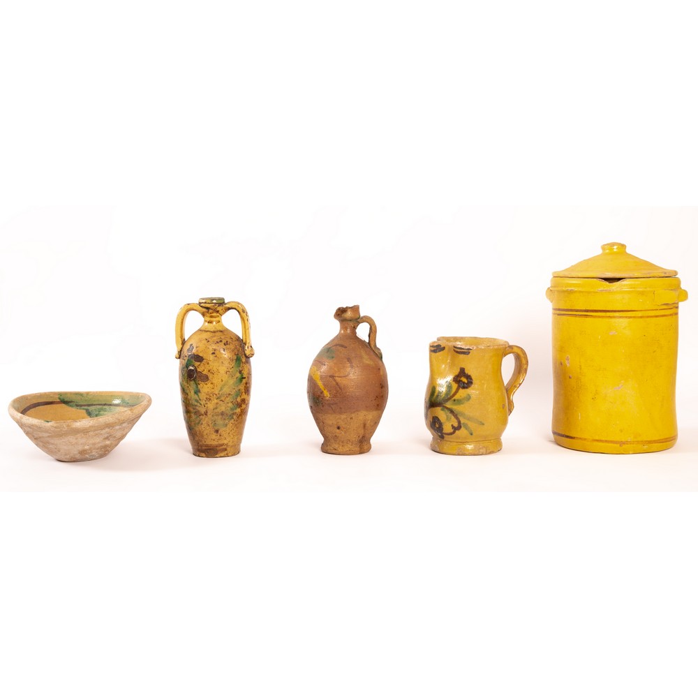 Burnia con coperchio, piccola cannata, due fiasche ed una ciotola in ceramica smaltata e decorata.