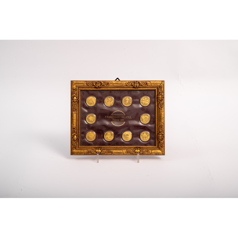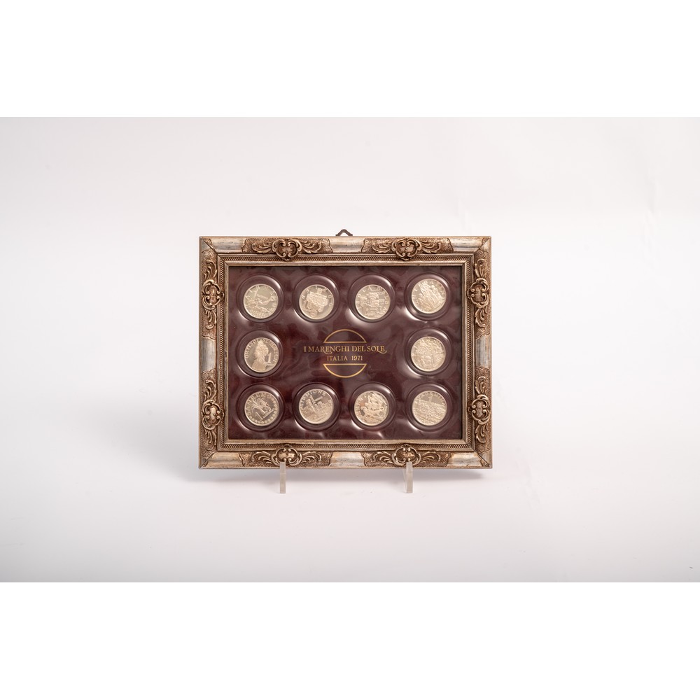Collezione di dieci monete 1 Marengo del sole in argento 925, anno 1971 entro cornice in legno argentato.