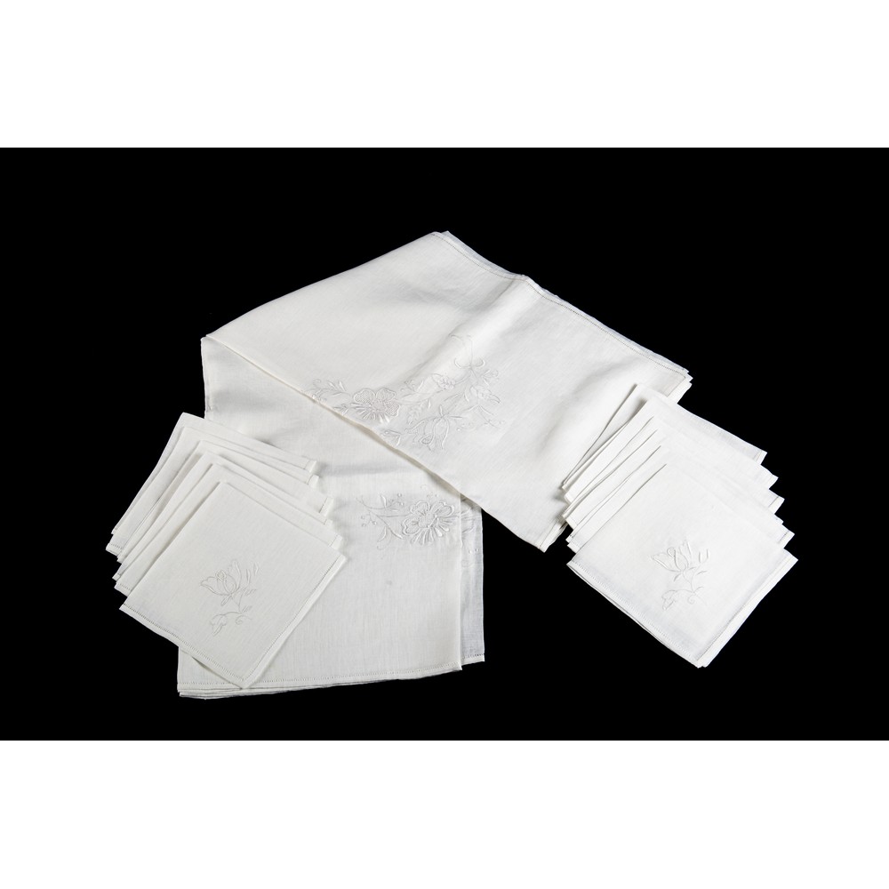 TOVAGLIA rettangolare e dodici tovaglioli in lino nei toni del bianco ricamati a mano.