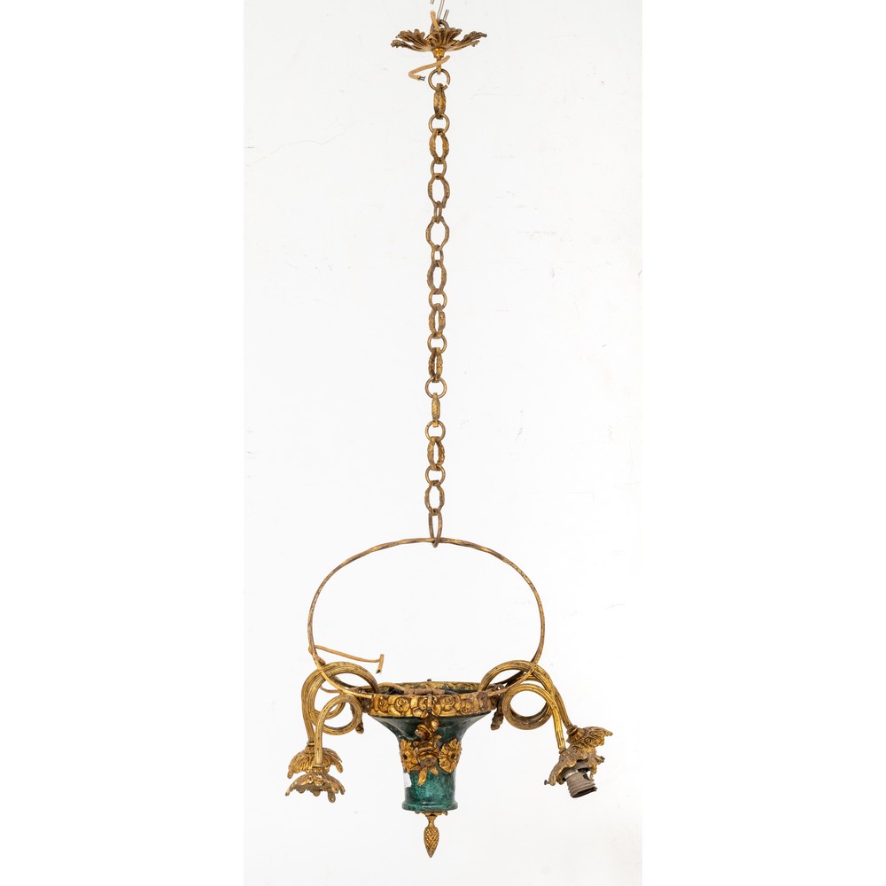 PICCOLO LAMPADARIO a paniere a quattro luci in bronzo e metallo laccato.