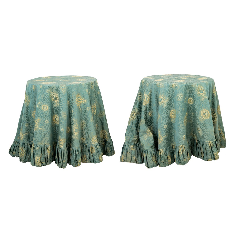 COPPIA TAVOLINI tondi habille' con tessuto damascato nei toni del verde.