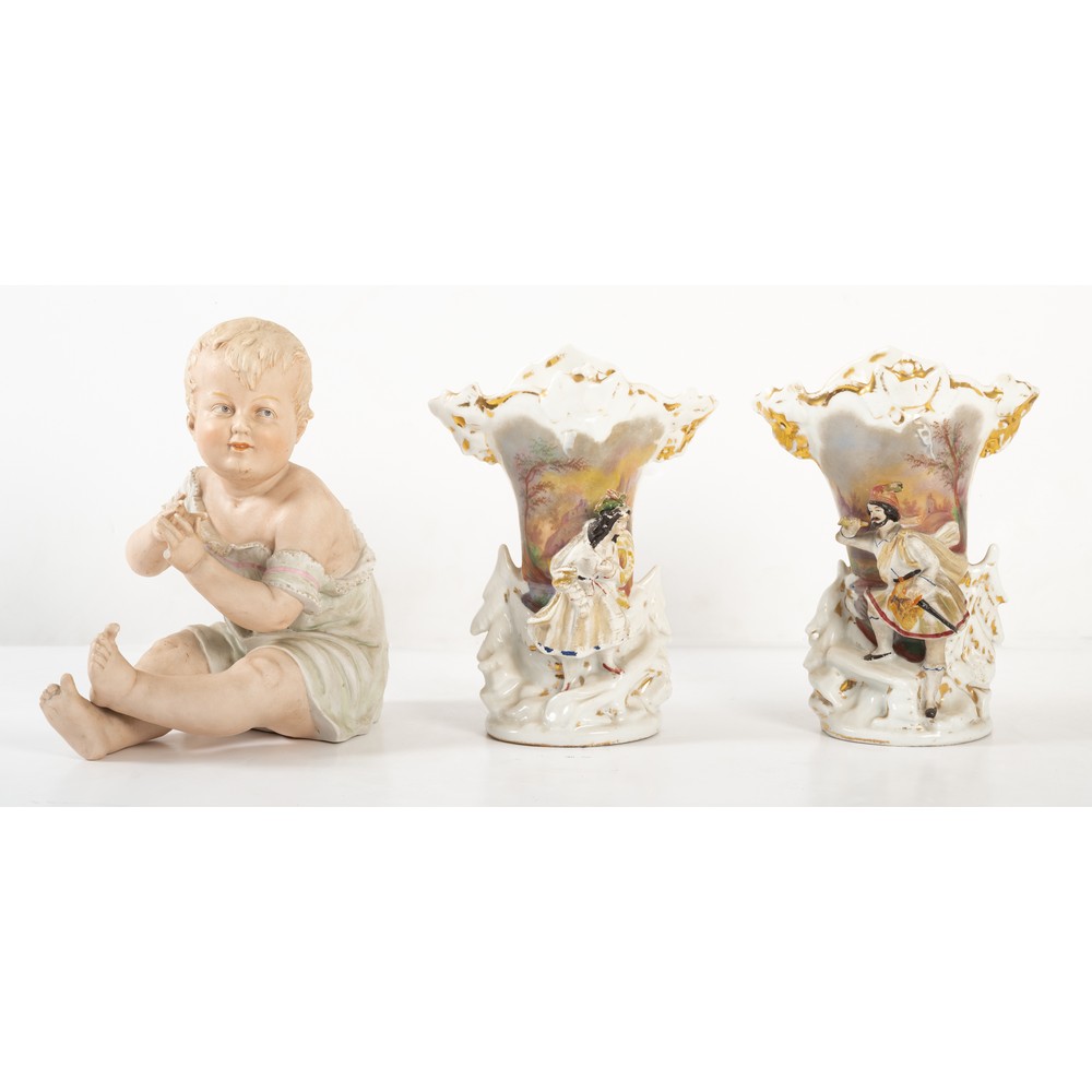 COPPIA DI VASI Luigi Filippo del XIX secolo in porcellana decorata con figure a rilievo e una scultura raffigurante bambino seduto in biscuit dei primi del '900.