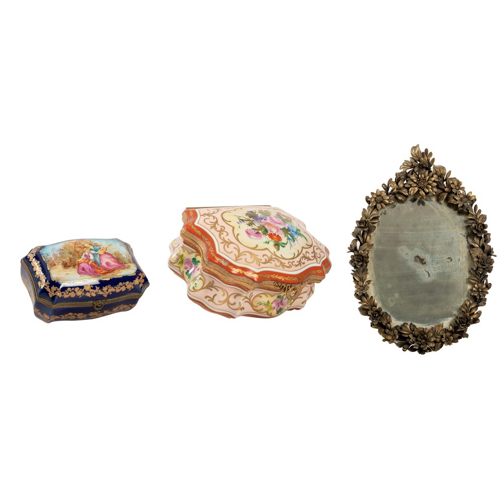 DUE PORTAGIOIE in porcellana decorata di cui uno Limoges e uno Sevres e una specchierina da cassettone con cornice a motivo floreale.