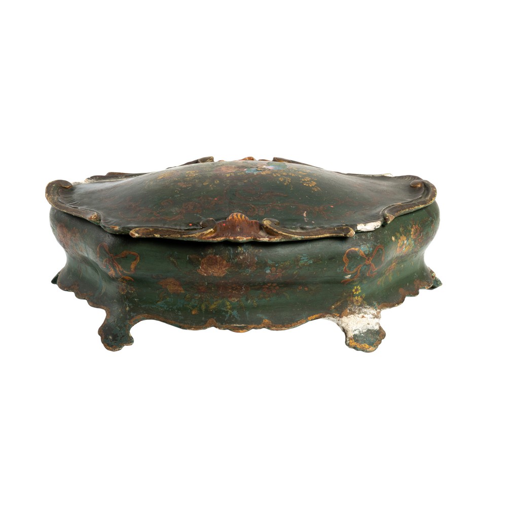 SCATOLA stile barocco in legno laccato nei toni del verde, dorato e decorato a motivo floreale e fogliaceo (restauro , mancanze e usure).