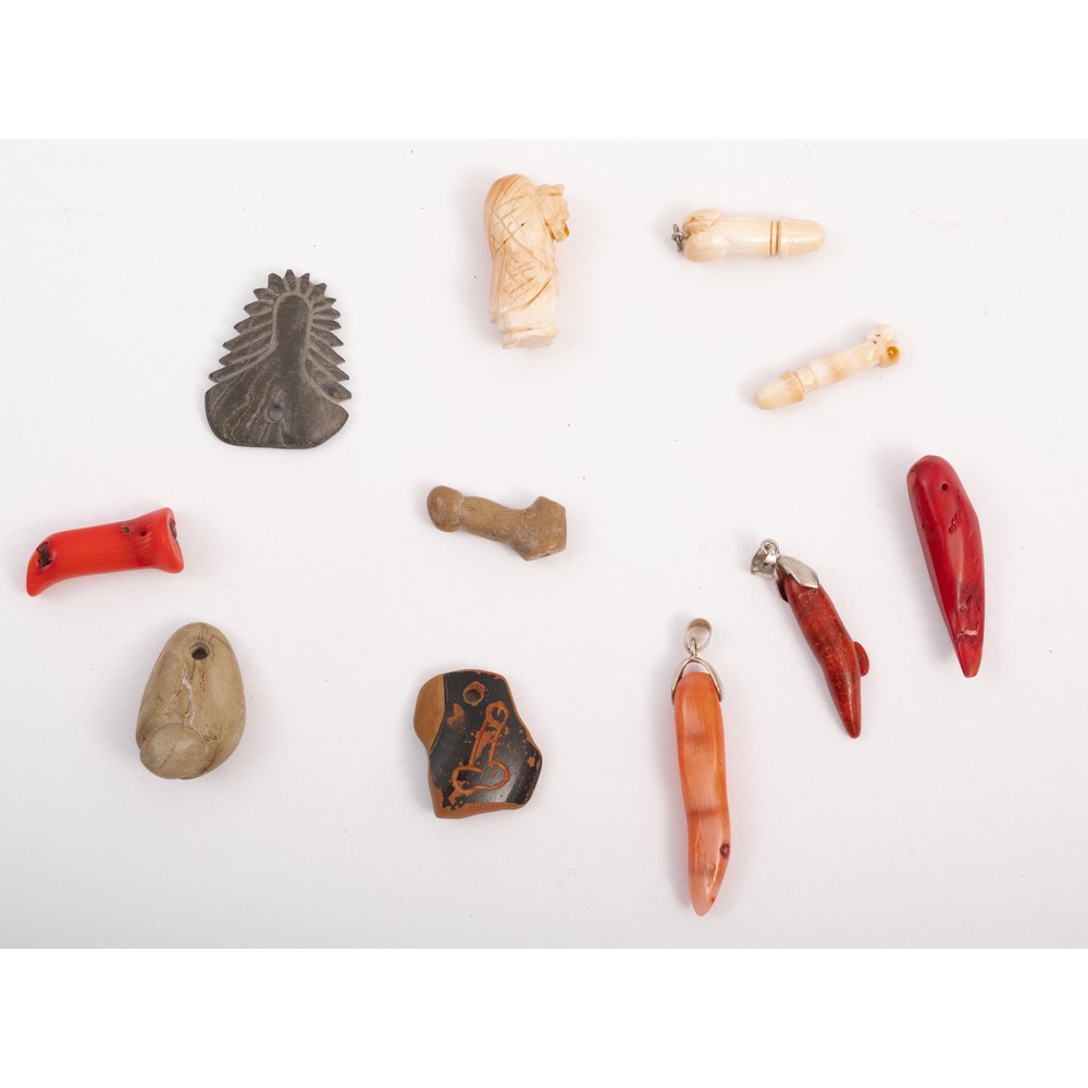 COLLEZIONE di undici portafortuna a forma di fallo in corallo rosso, corallo rosa, osso e pietre dure.