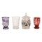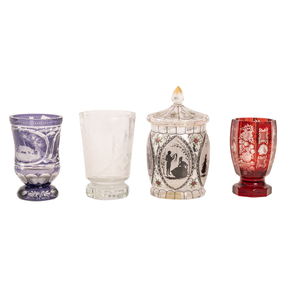 TRE BICCHIERI E UN BARATTOLO in vetro lavorato.