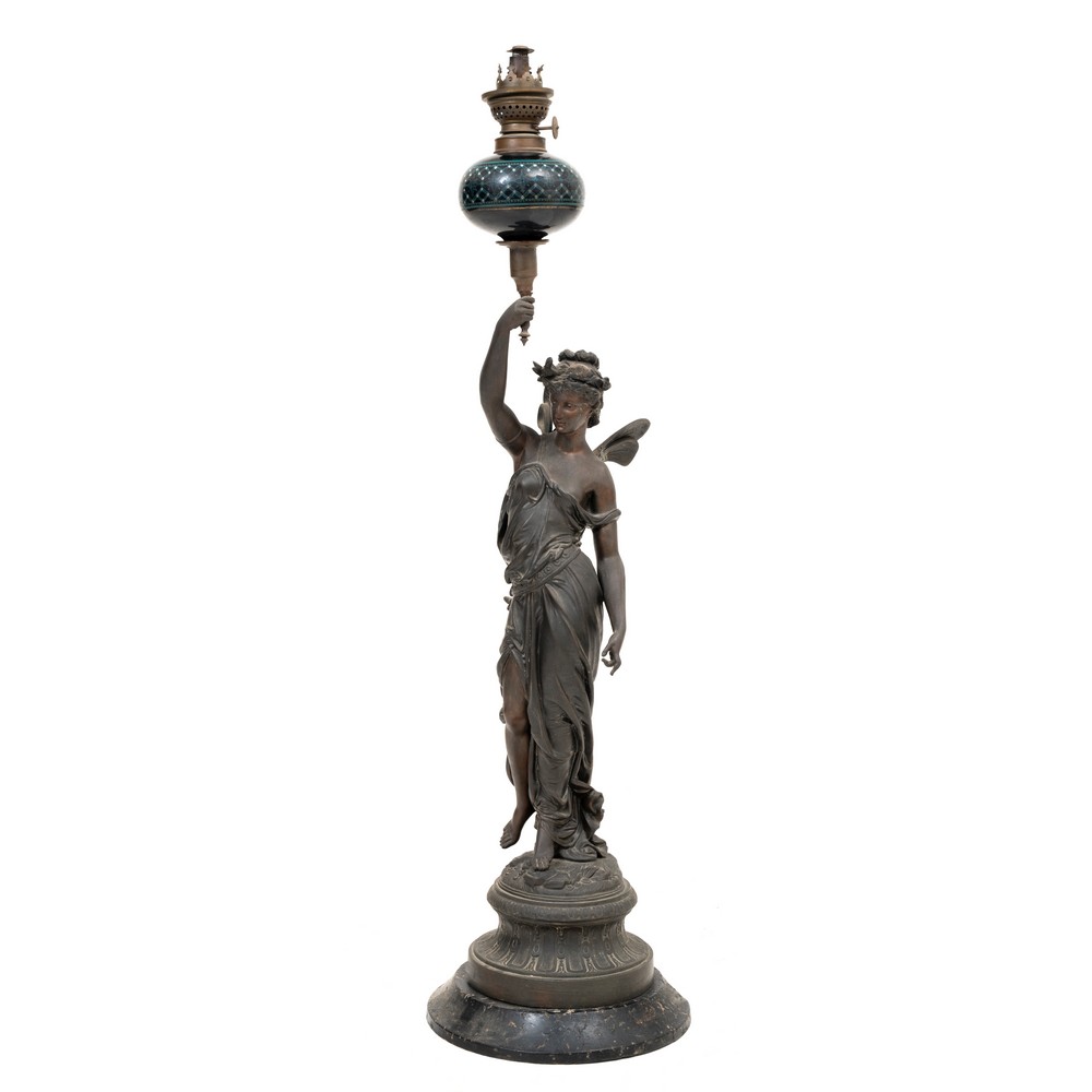 LUME a petrolio in metallo con base in marmo sorretto da figura femminile alata