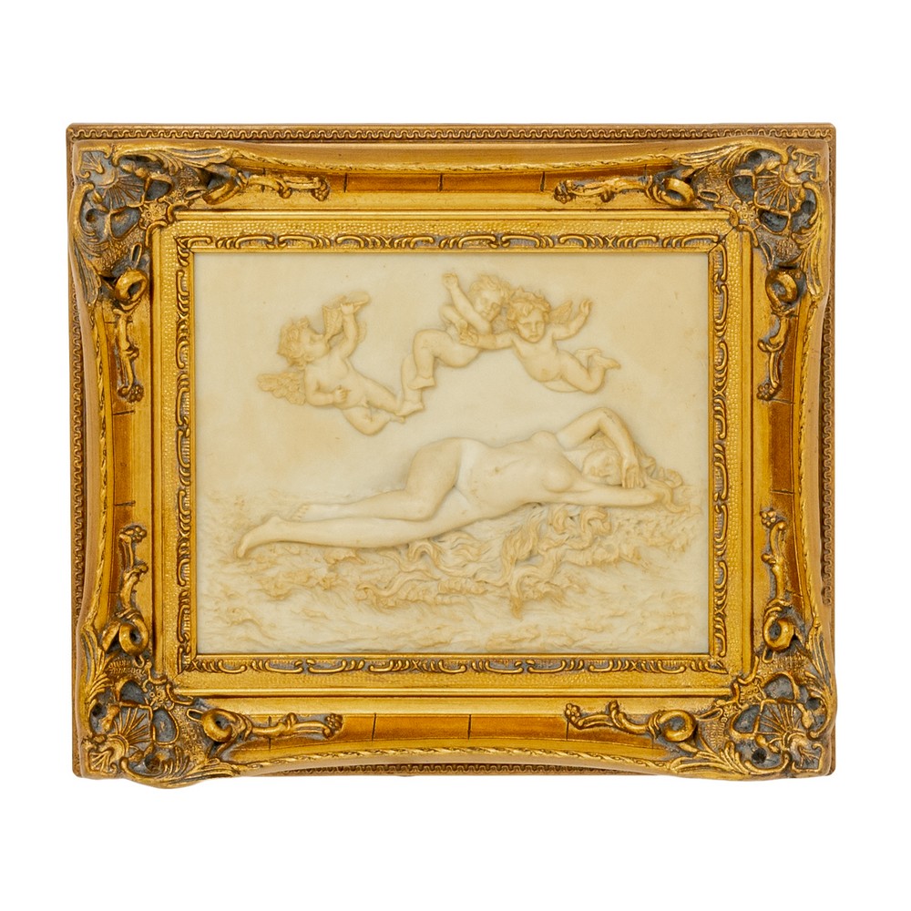 BASSORILIEVO in pasta tipo marmorea raffigurante figura femminile con putti entro cornice dorata.