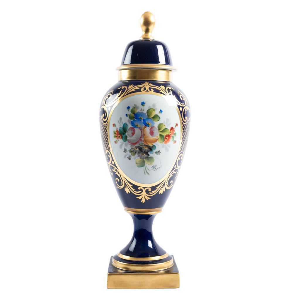 POTICHE in porcellana Limoges decorata e dipinta a motivo floreale, lumeggiature in oro.
