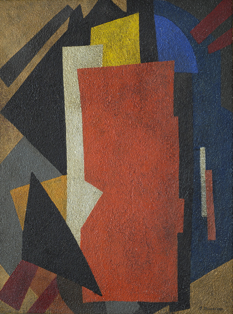 Ljubov Sergeevna Popova (Ivanovskoe, 1889 - Mosca, 1924) COMPOSIZIONE CUBO-SUPREMATISTA, 1920 Olio su tavola, cm. 61x50,5 Firma e data in basso a destra. In quest’opera la presenza di elementi quasi astratti anticipa taluni risultati che saranno propri del Suprematismo. Ma è ancora l’aspetto alogico a prevalere, a dimostrazione di una coerenza rispetto alle linee futuriste. Elementi caratteristici di questo lavoro della Popova sono la compiutezza compositiva e la chiarezza del tratto, nonché l’aspirazione dell’artista a svelare in pieno l’unità della struttura spazio volumetrica, che in questo caso specifico prevale sulle questioni del movimento e della dinamica. In quest’opera l’artista elimina la profondità spaziale e di conseguenza lo sfondo smette di essere tale. Il dipinto appare quindi più correlato con il cubismo e, soprattutto , con il suprematismo, piuttosto che con il futurismo. Ecco perché cominciano ad apparire forme geometriche, come il rettangolo, ilquadrato, il trapezio. Vengono confermati senza dubbio i principi relativi alla costruzione della composizione ed alla ricerca formale, così come è evidente la tendenza dell’artista ad adottare un procedimento costruttivo nuovo nell’organizzazione dello spazio. A mio parere l’opera riassume alcuni dei momenti principali del percorso artistico della Popova. Estratto dal Certificato di autenticità del Dott. Cesare Lisandria.