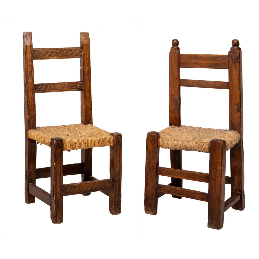 DUE SEDIOLINE in legno di castagno, con seduta in corda.