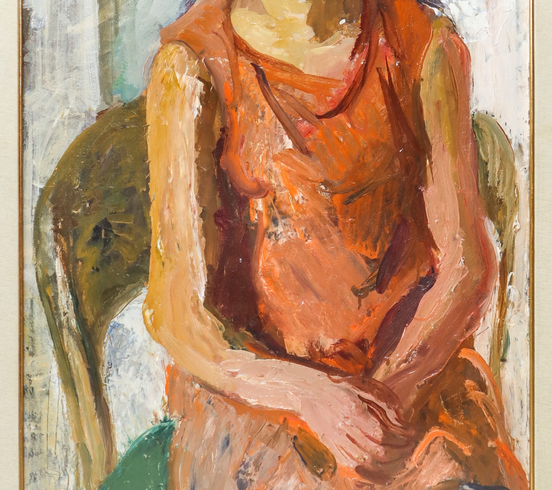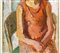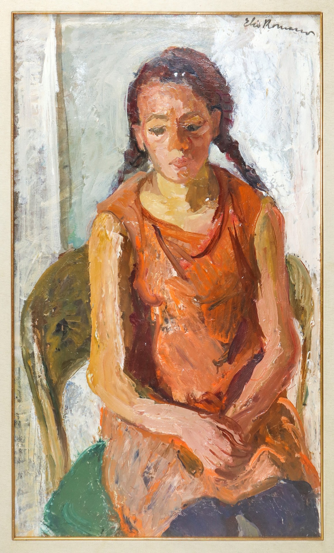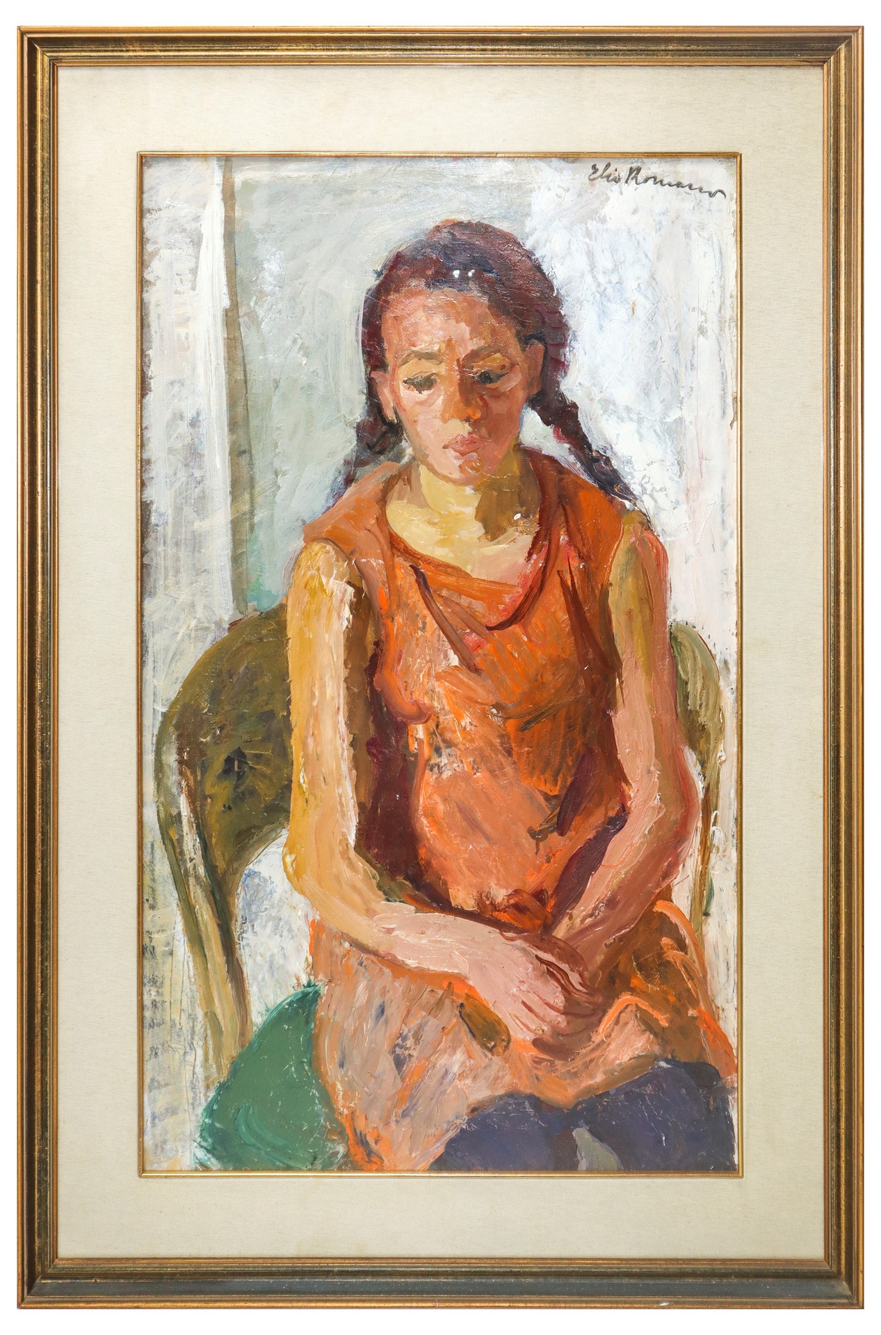 Elio Romano (Trapani 1909-Catania 1996) - Ragazza seduta cm 85x50; in cornice cm 103x68 Olio su tela Firmato in alto a destra.
