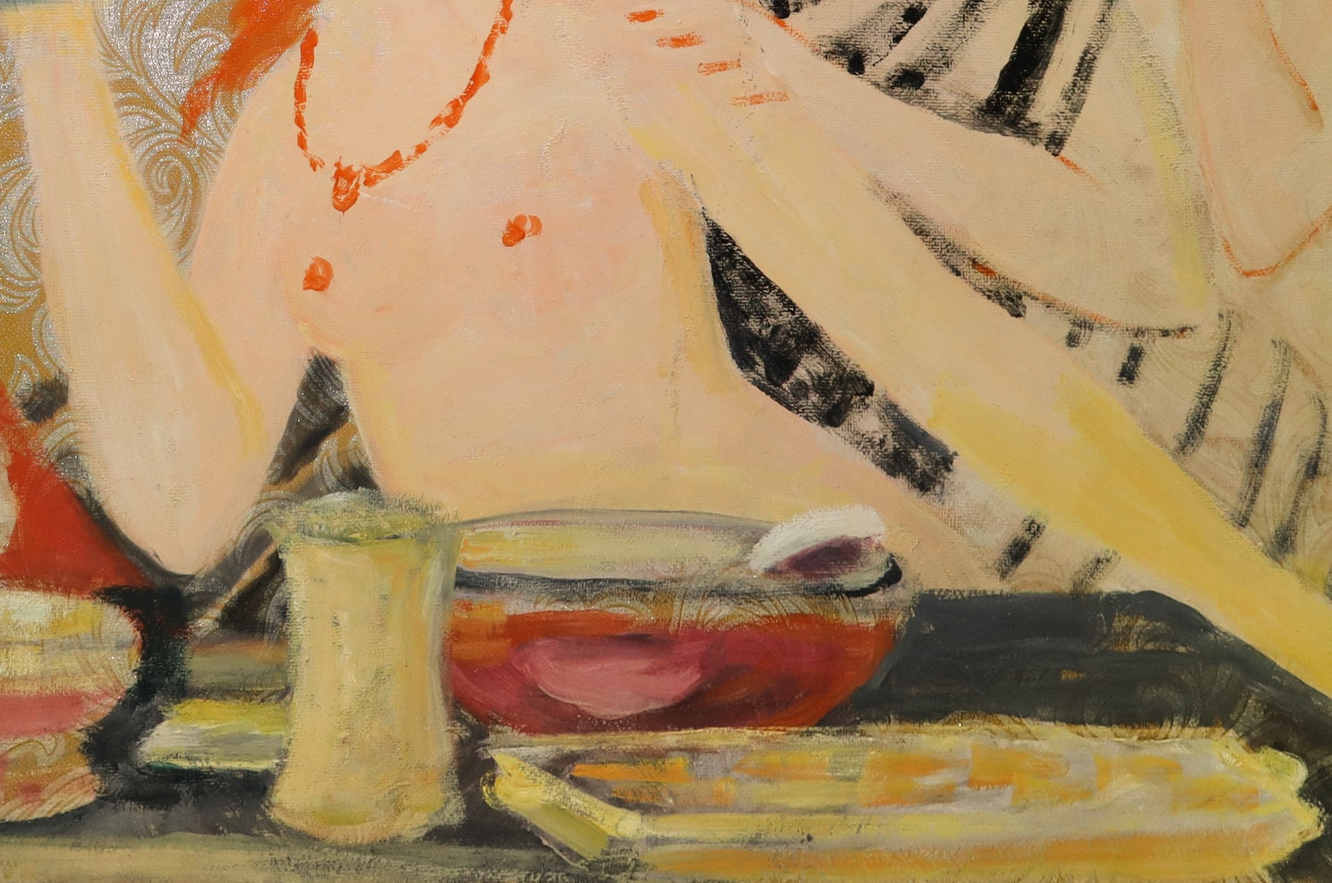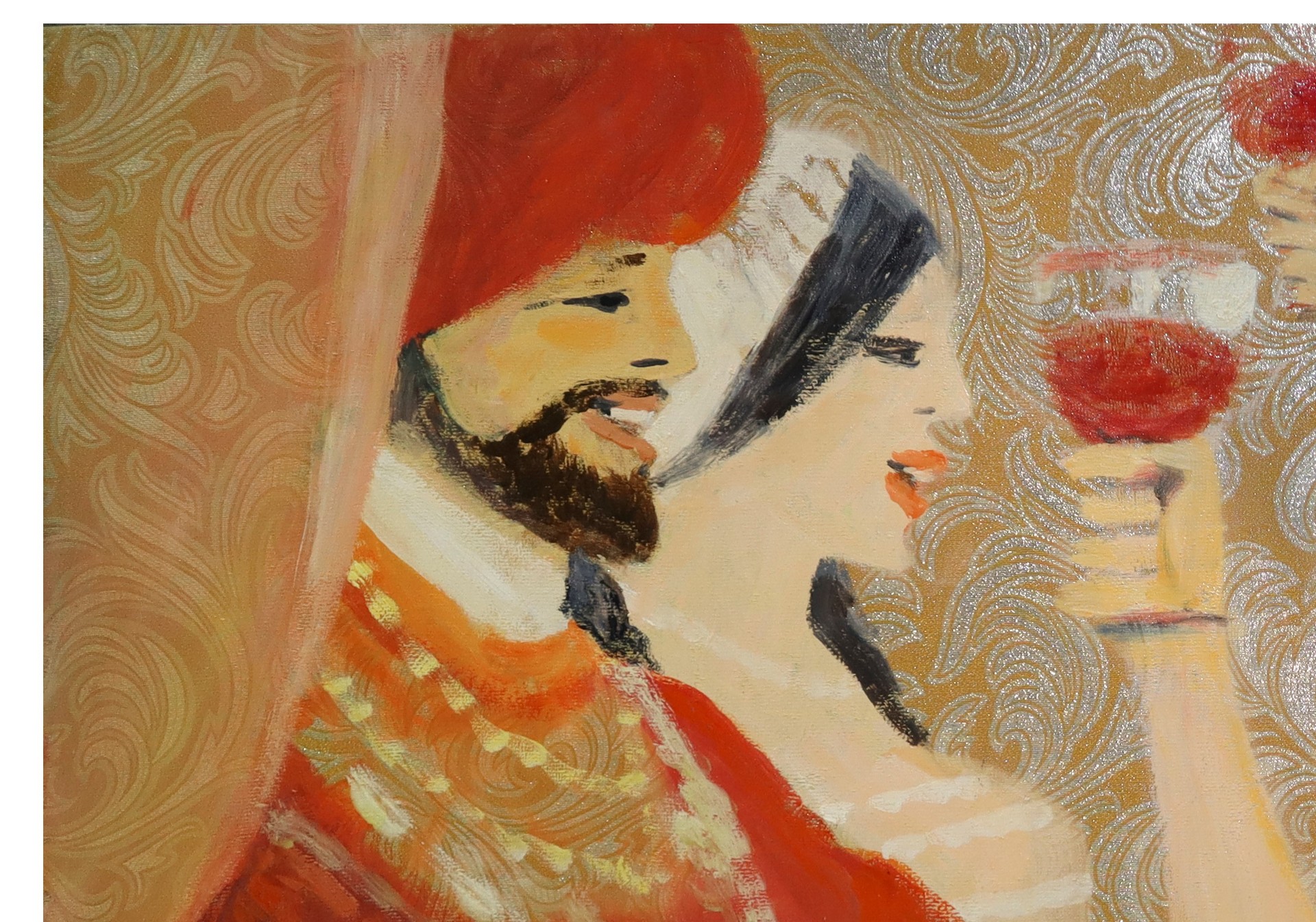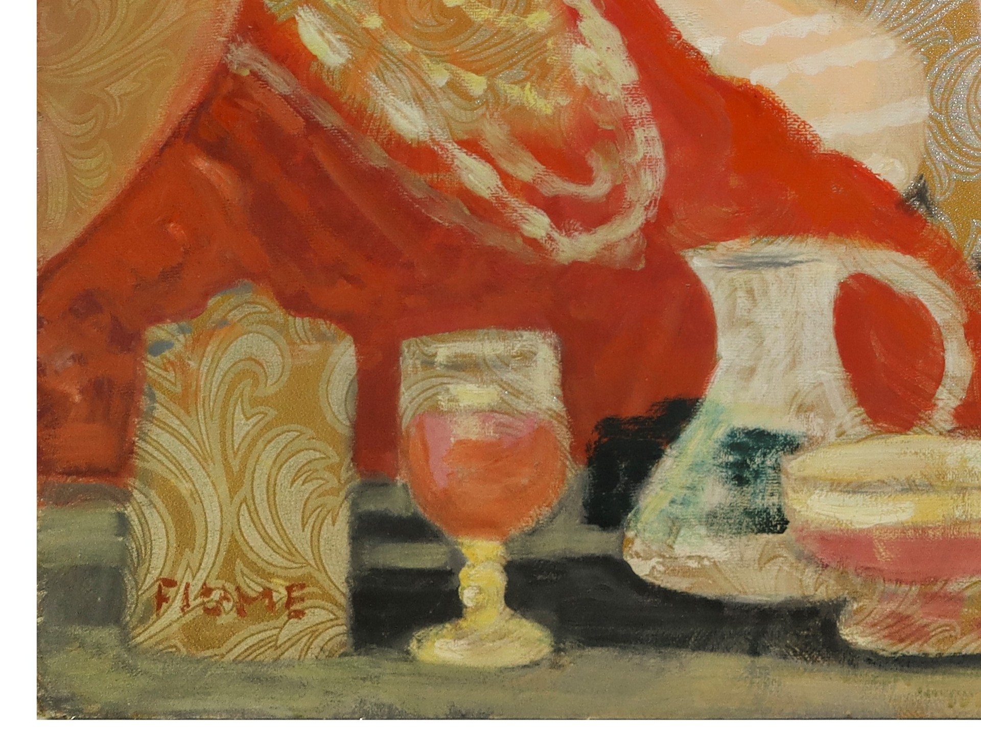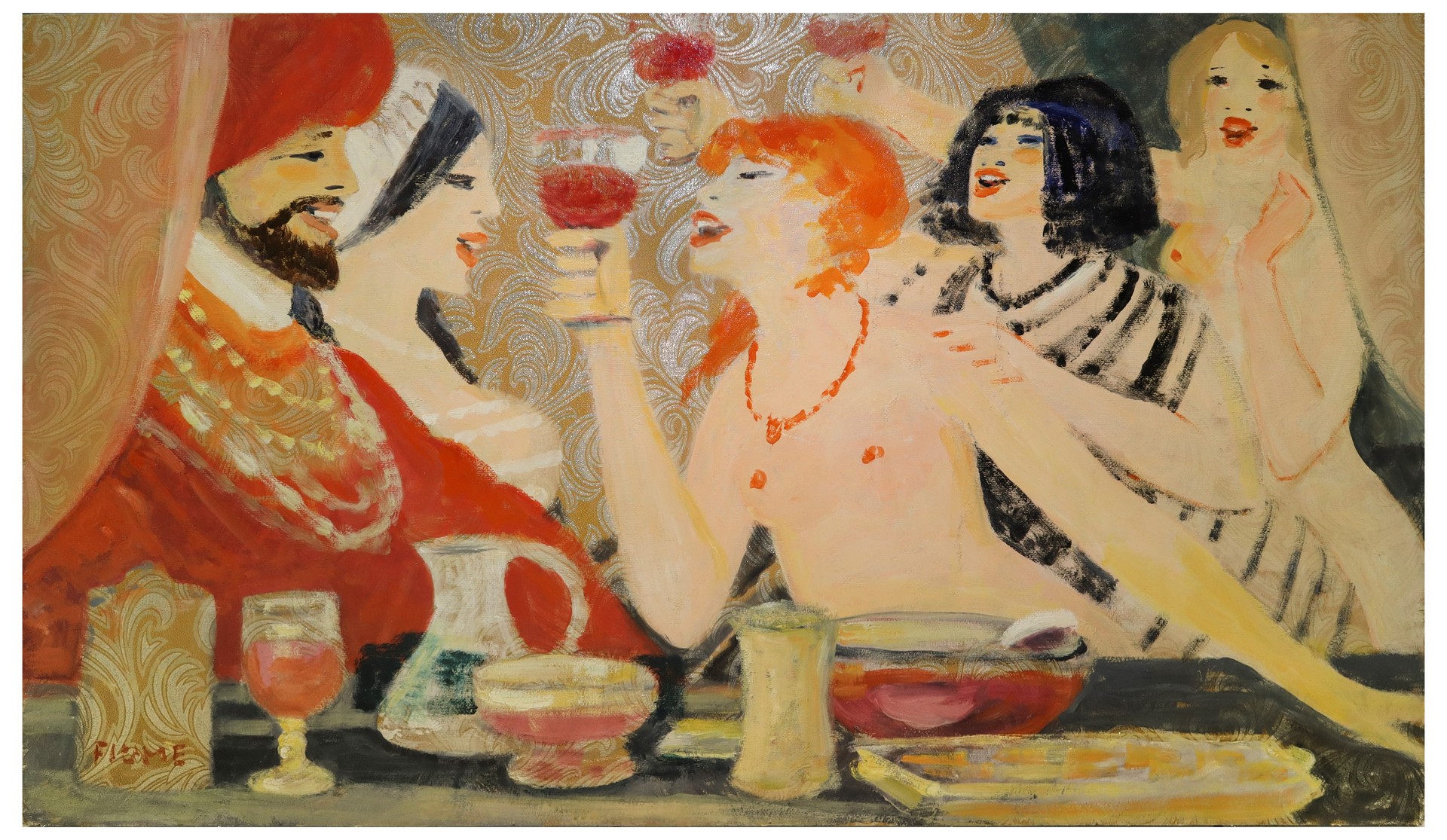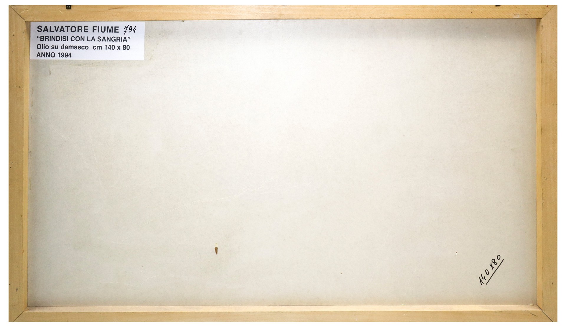 Salvatore Fiume (Comiso 1915-Milano 1997) - Brindisi con la sangria cm 80x140 Olio su damasco Opera unica. Firmato in basso a sinistra , stampatello rosso FIUME. Certificato della Fondazione Salvatore Fiume, N.Archivio 93/07