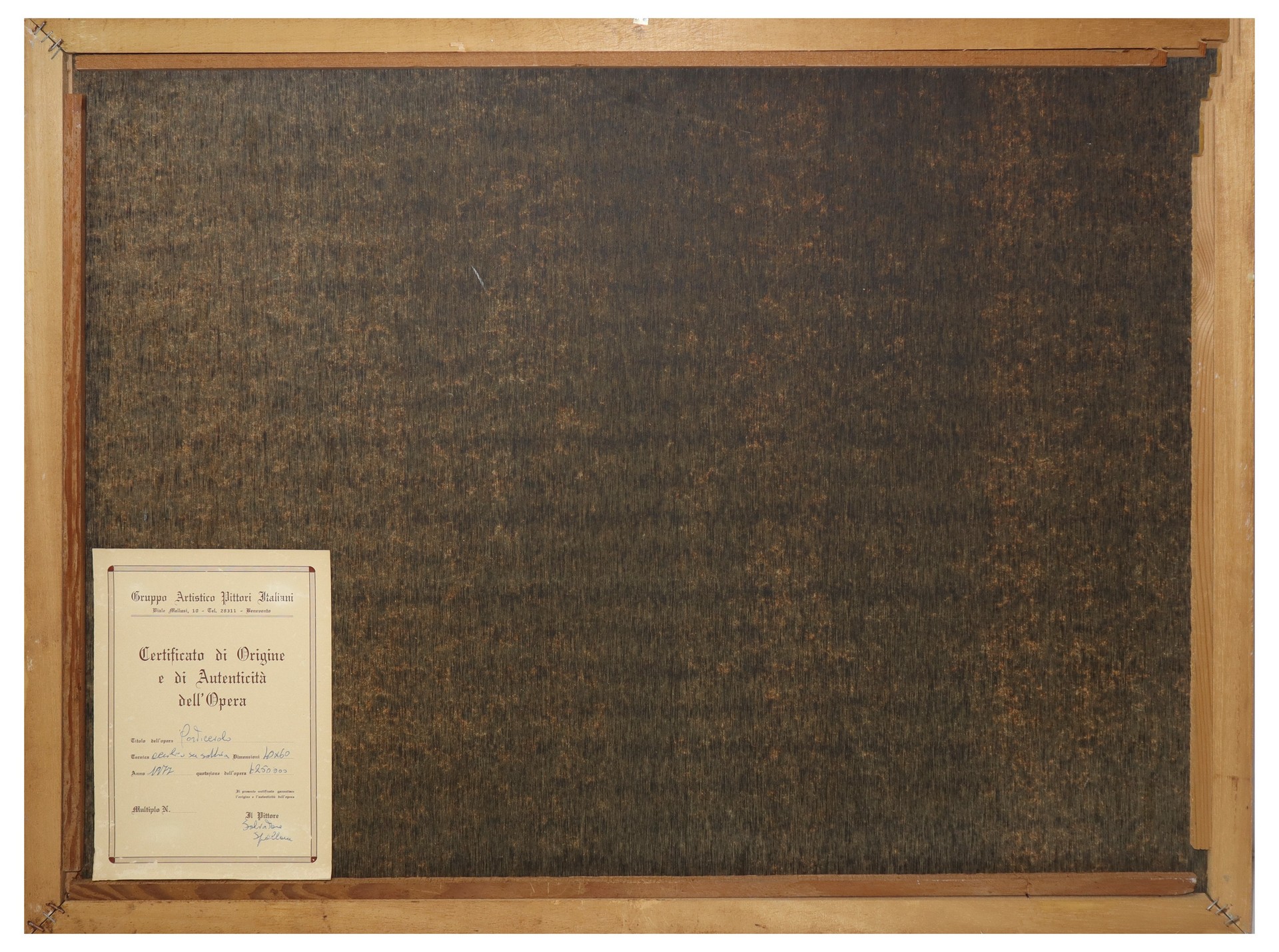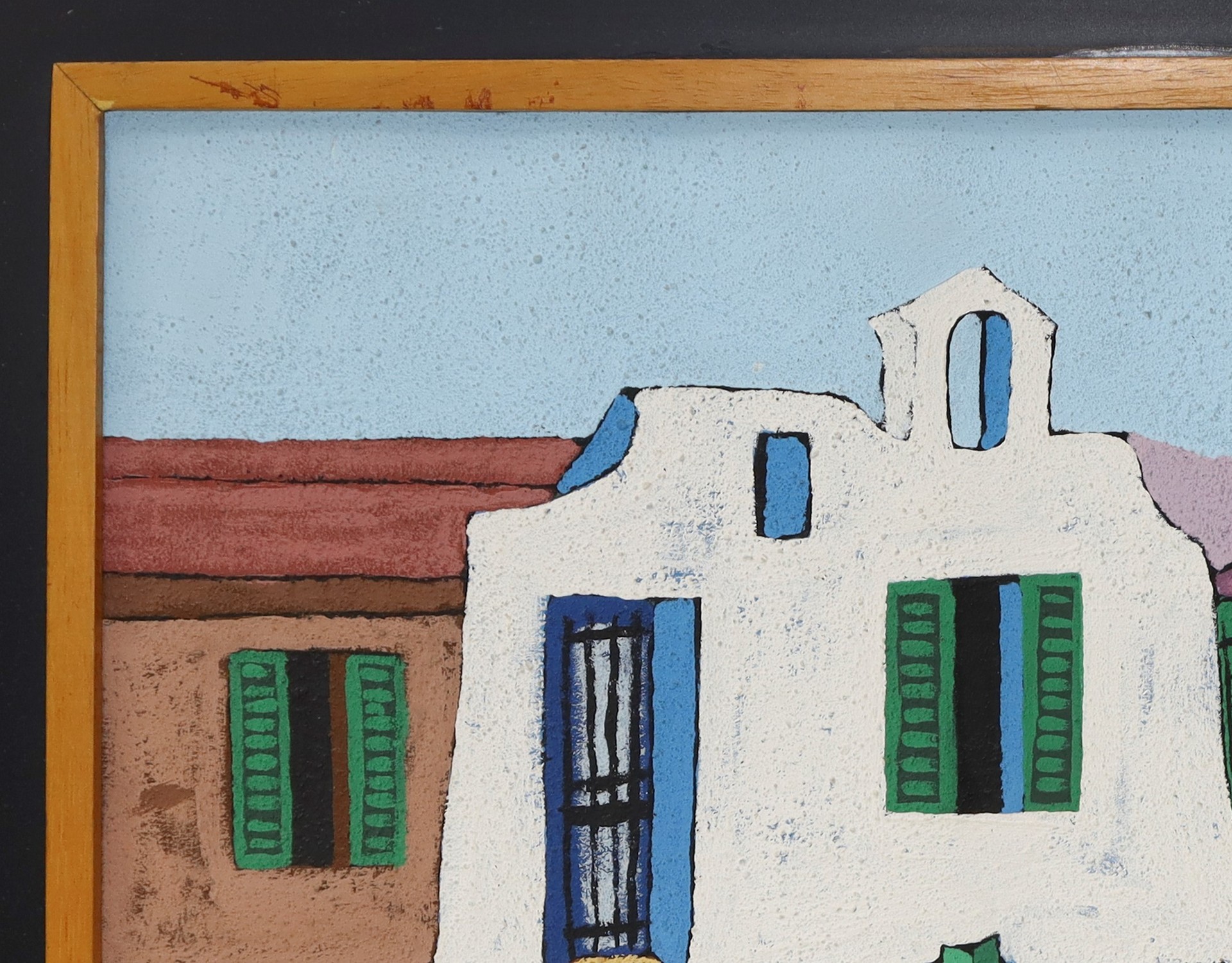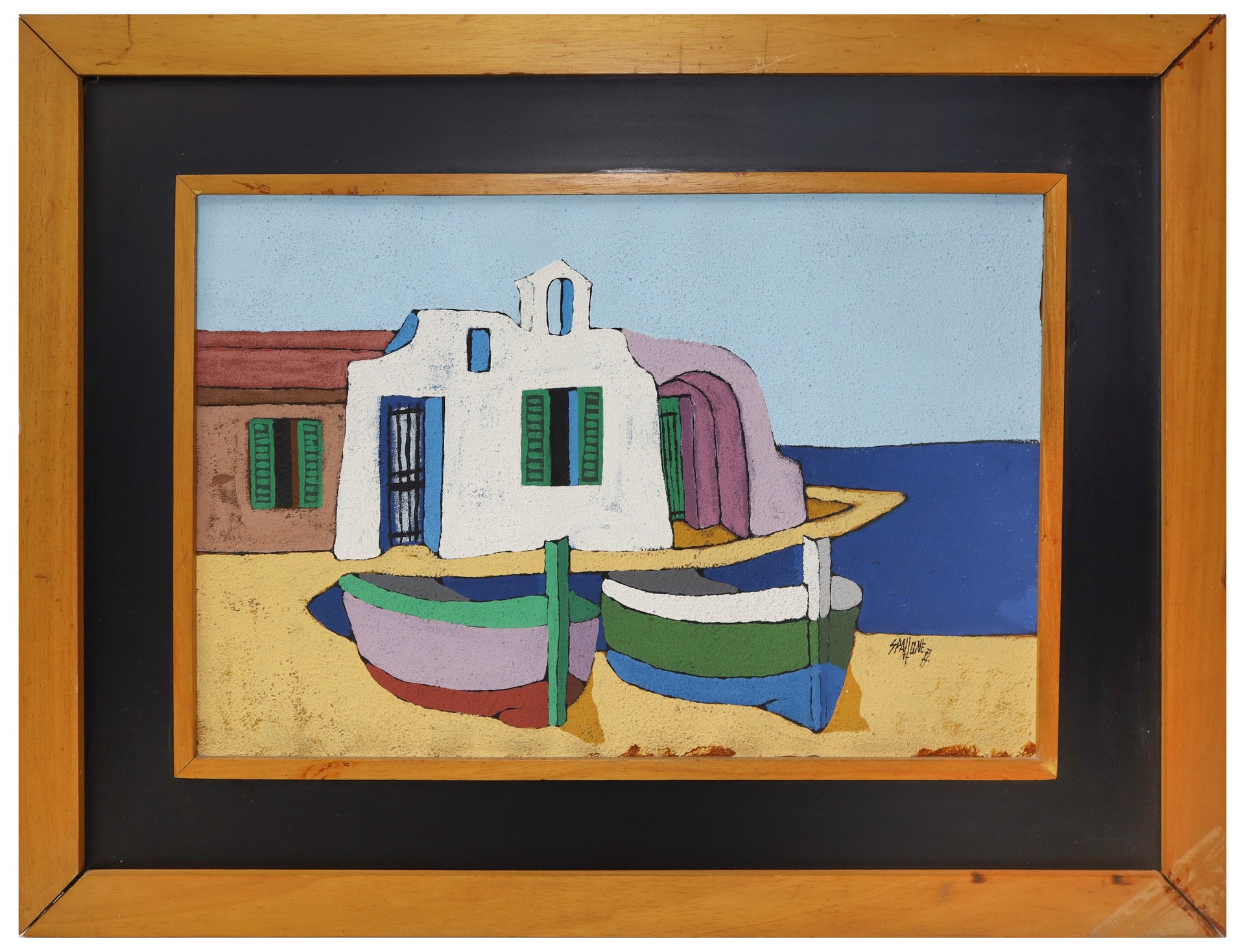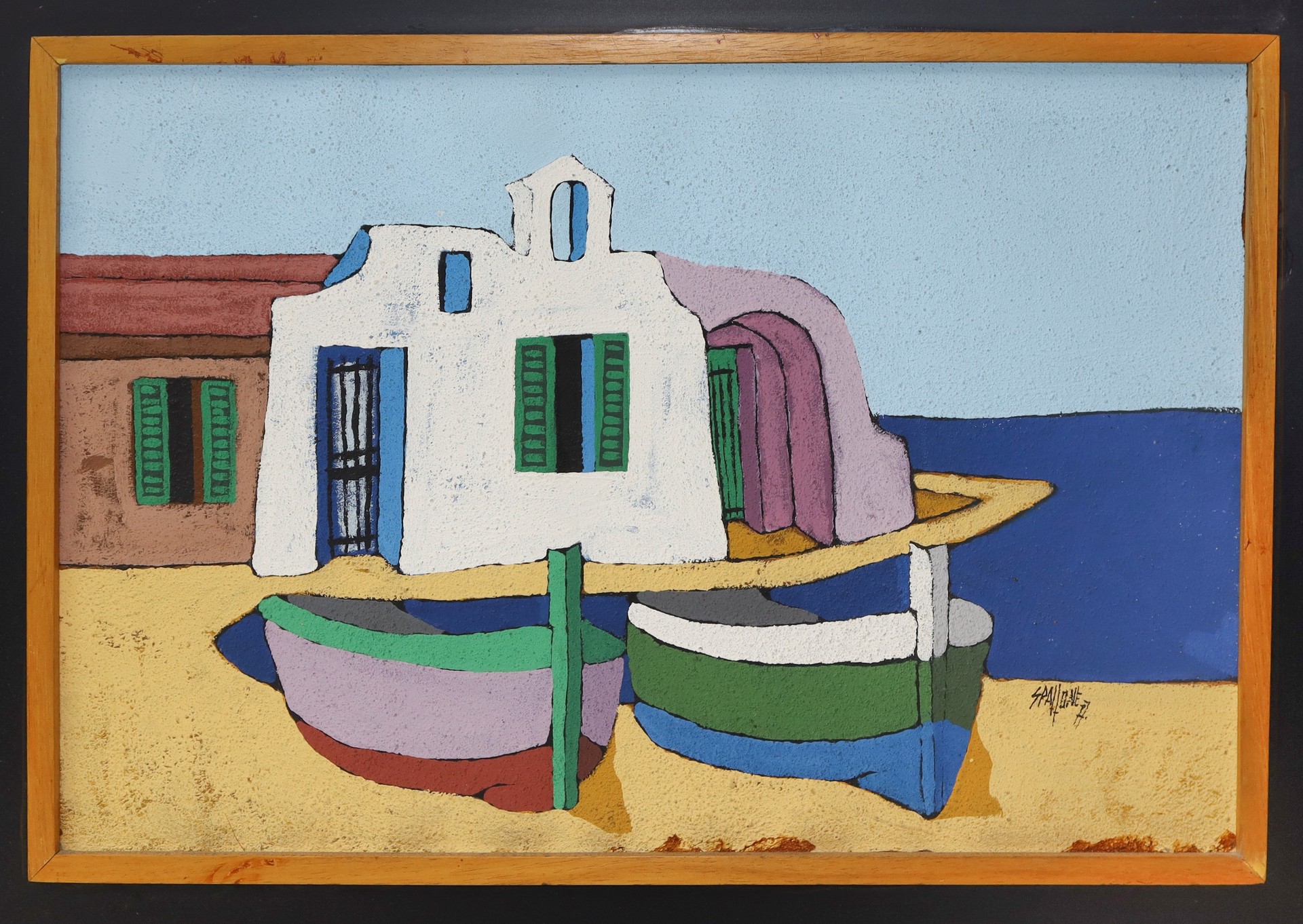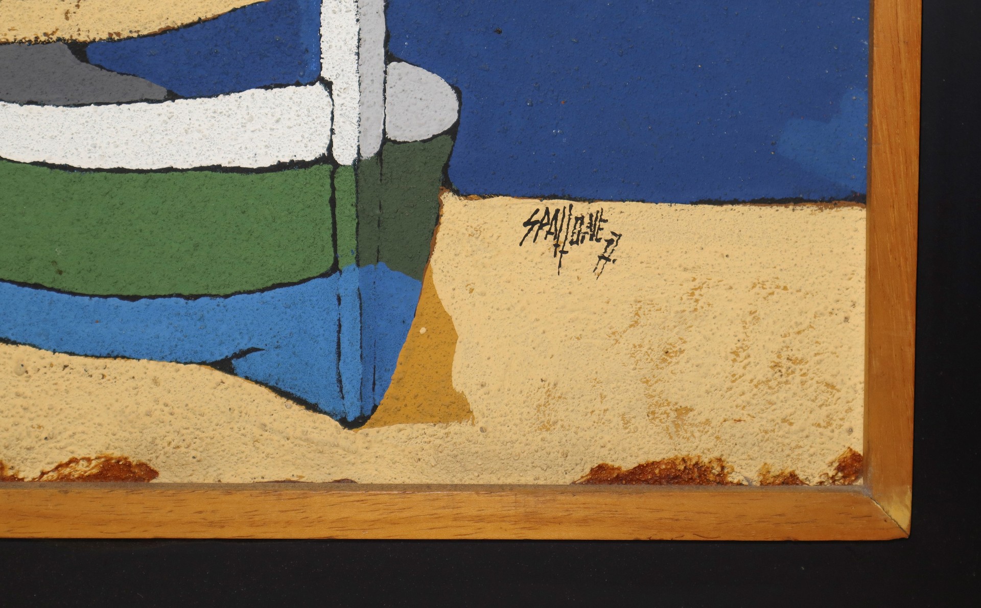 Salvatore Spallone (1951-1978) - Porticciolo con barche cm 40x60; in cornice 65x85 Tecnica mista acrilico e sabbia Firmato in basso a destra.