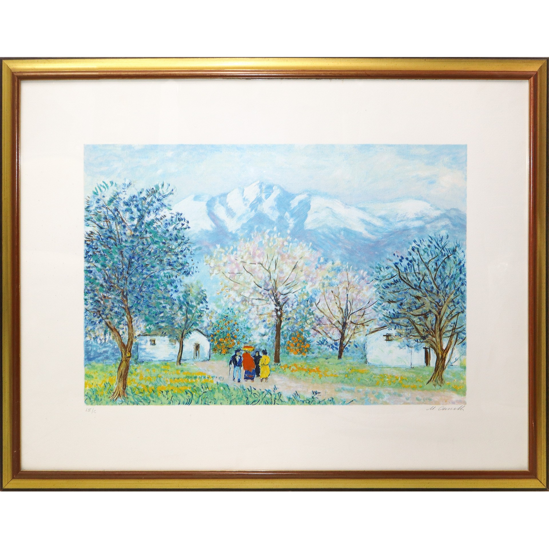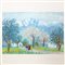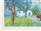 Michele Cascella (Ortona 1892-Milano 1989) - Casa con alberi e personaggi Cm 93x71 Litografia P.A. Firmato in basso a destra
