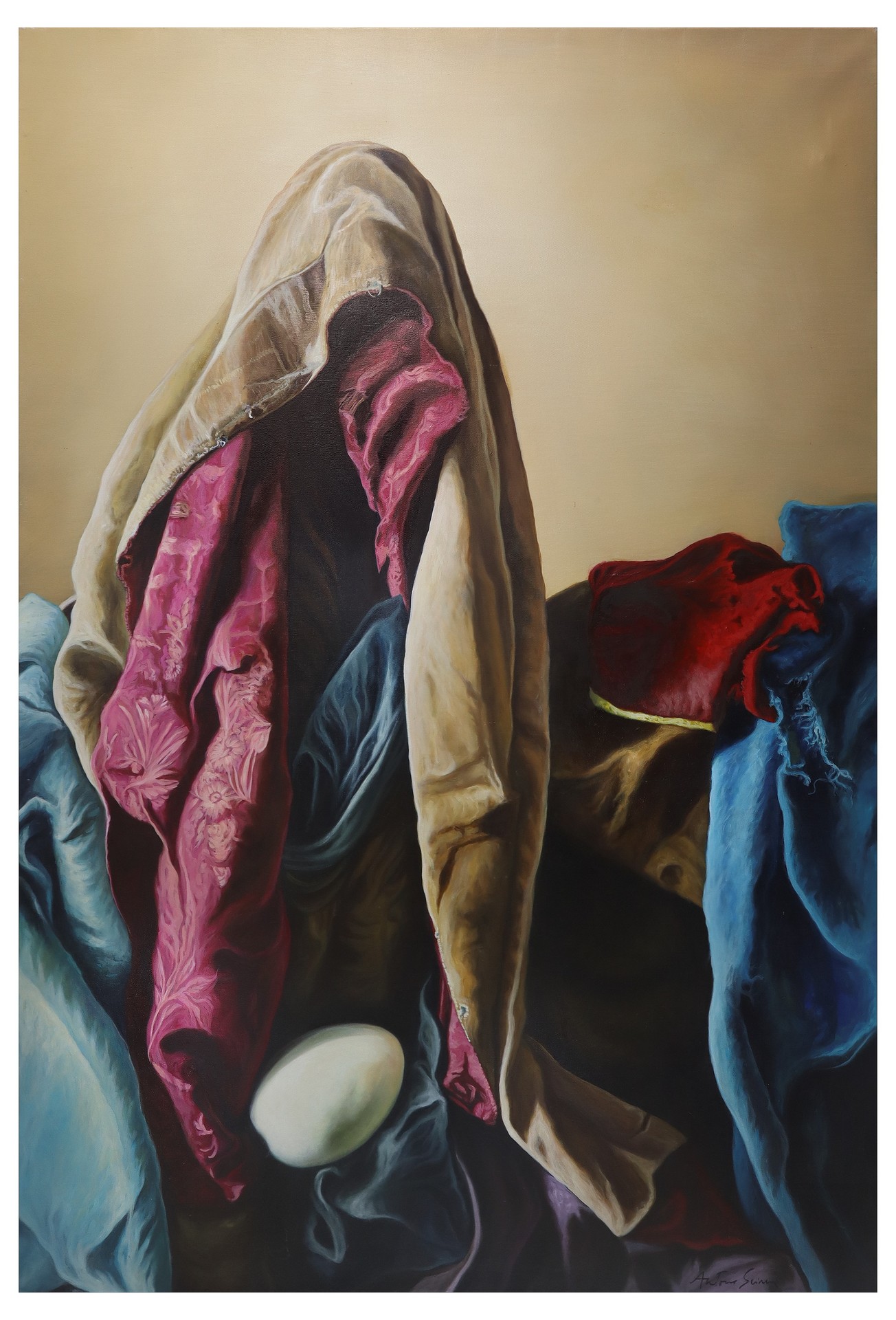 Antonio Sciacca (Catania 1957) - Manichino con stoffe e uovo cm 150 x cm 100 Firmato in basso a destra e sul retroFirmato in basso a destra e sul retro