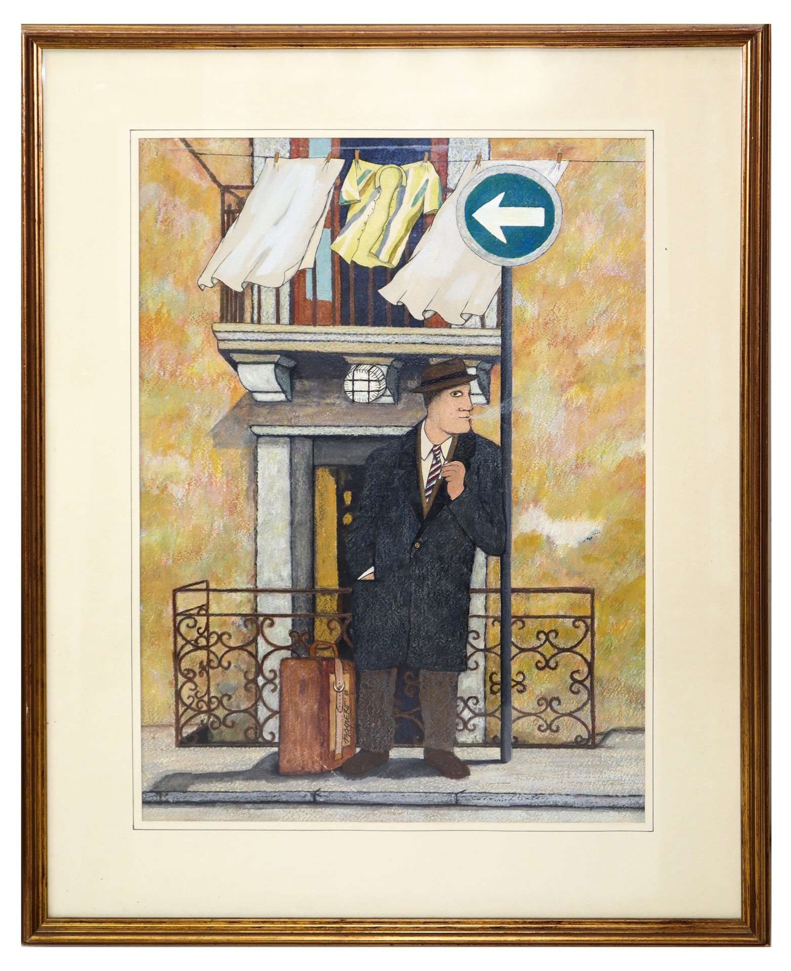 Uomo con cappello appoggiato a una ringhiera Cm h 60 x 45, in cornice cm h 79 x 64 Pastello su cartoncino