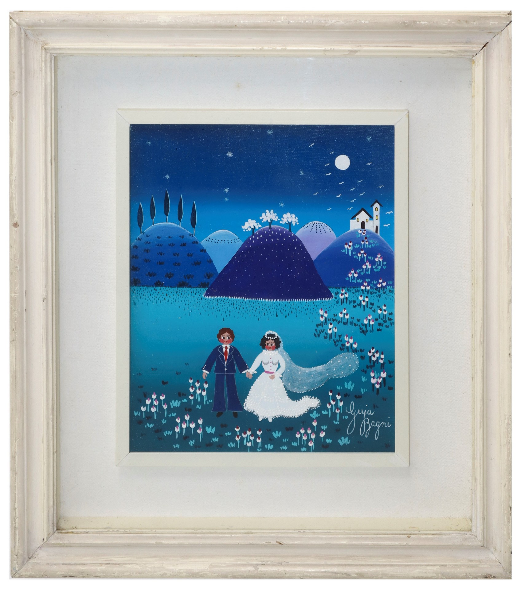 Guja Bagni (XX) - ''Verso la felicità'' cm 25x20; in cornice cm 42x37 olio su cartoncino Firmato in basso a destra. Sul retro timbro, firma della pittrice e datazione. Sul telaio firma della Galleria Selearte Moderna di Milano