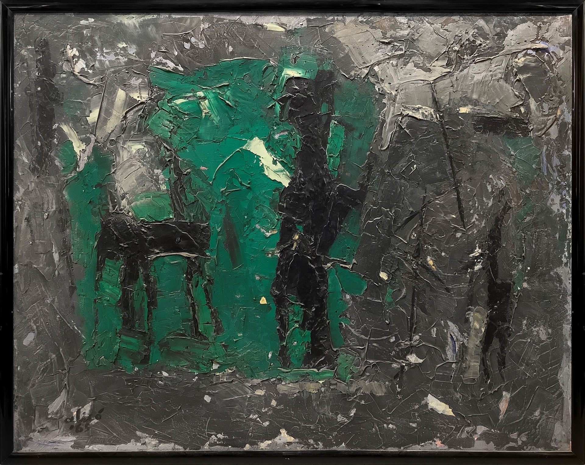Giovanni Alicò (Catania 1906-Milano 1971) - Parete n.2 70x90 cm Idropittura su tela Giovanni Alicò nasce a Catania nel 1906. Pittore autodidatta, il suo approccio all'arte è libero da vincoli o binari precostruiti. Nel 1935 si stabilisce prima a Napoli poi a Milano. Nel 1942 è presente con un'opera alla XXIII Biennale di Venezia,e nello stesso anno, tiene la sua prima mostra personale alla Galleria Tornabuoni di Firenze. Seguono, tra il 1948 e il 1953, sei anni di attività in Argentina,con tre personali a Buenos Aires e molte partecipazioni a collettive in diversi saloni nazionali nelle città di La Rioja, Santa Fè, Mendoza e Rosario. Rientrato in Italia, dalla metà degli anni Cinquanta e per tutto il decennio successivo diverse furono le sue personali a Catania, Milano, Roma e Como. E' stato Premio Suzzara nel 1955 con l'opera Contadino che riposa, dove il pittore, svincolato da una fredda descrizione realistica e lontano dagli schemi neocubismo tipici del primo dopoguerra, si abbandona ad una pittura di suggestione luministica, dalle larghe campiture di verdi, di grigi, di terre, sostenuta da una densa materia pittorica definita da una spessa linea di contorno. Il dipinto è attualmente conservato nella Galleria Civica d'Arte Contemporanea di Suzzara. Nel 1957 ha esposto alla Galleria il Pincio a Piazza del Popolo a Roma, una delle realtà più attive nel panorama delle mostre d'arte, dove vi esponevano anche Renato Guttuso e Carla Accardi. Ha iniziato il suo percorso artistico raffigurando nella sua pittura i carretti con le colorite storie dei pupi utilizzando tinte preferibilmente piatte, successivamente introduce nella sua tavolozza cromie delicate,vibranti,e si concentra su temi pervasi da una marcata spiritualità. I soggetti favoriti sono figure femminili, nature morte e paesaggi. Negli Anni Cinquanta Giovanni Alicò avvicina il suo stile a quello di Guttuso, nell'ambito del realismo sociale. La sua attenzione è verso una pittura figurativa sintetica,che procede per suggestioni nella generale aderenza ai temi del realismo sociale. Dopo il 1960 entra nella sua opera un’importante poetica fatta di arabeschi e effetti luminosi e cromatici mobilie sfumati. Dal 1967 compaiono su tali sfondi personaggi antropomorfi, sorta di fantasmi,che si librano nello spazio della composizione. La produzione ultima dell'artista è invece caratterizzata da dipinti dove segni, forme geometriche ripetute e ampie macchie di colore sono resi con cromie intense e vivide approdando a esiti di natura informale e materica. Giovanni Alicò muore a Catania nel 1971. Dopo la sua morte, viene allestita una importante retrospettiva al Palazzo della Borsa di Catania nel 1973. Molte delle sue opere sono presenti in importanti collezioni private in Europa e in America e in diverse fondazioni d'arte.