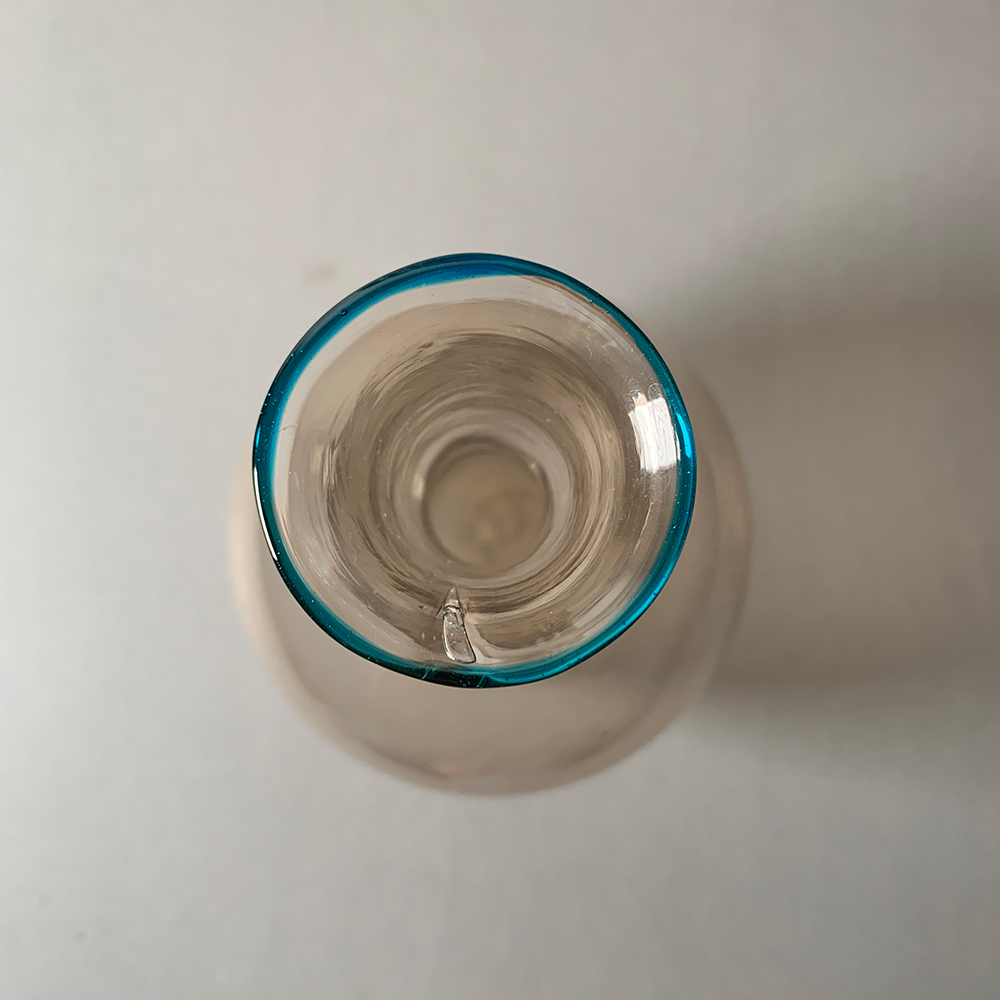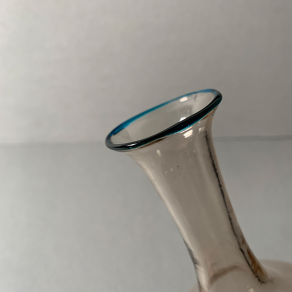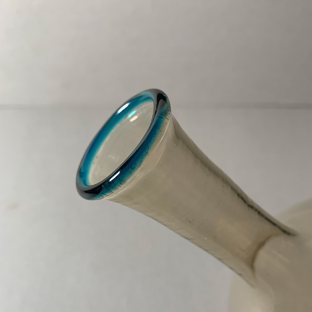 MURANO - Ensemble di 4 bottiglie con tappo in vetro soffiato pagliesco e bordo superiore decorato di azzurro, anni ‘30, altezze cm 27,5; cm 31,2; cm 31; cm 28.