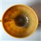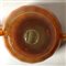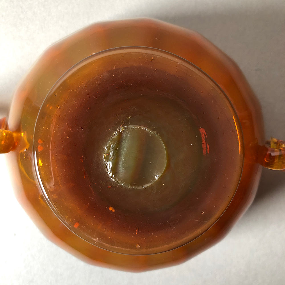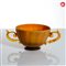 MURANO - Coppa in vetro opalino ambra con piede e anse applicate in vetro trasparente color miele, anni ‘30, lunghezza cm 24,5; altezza cm 10.