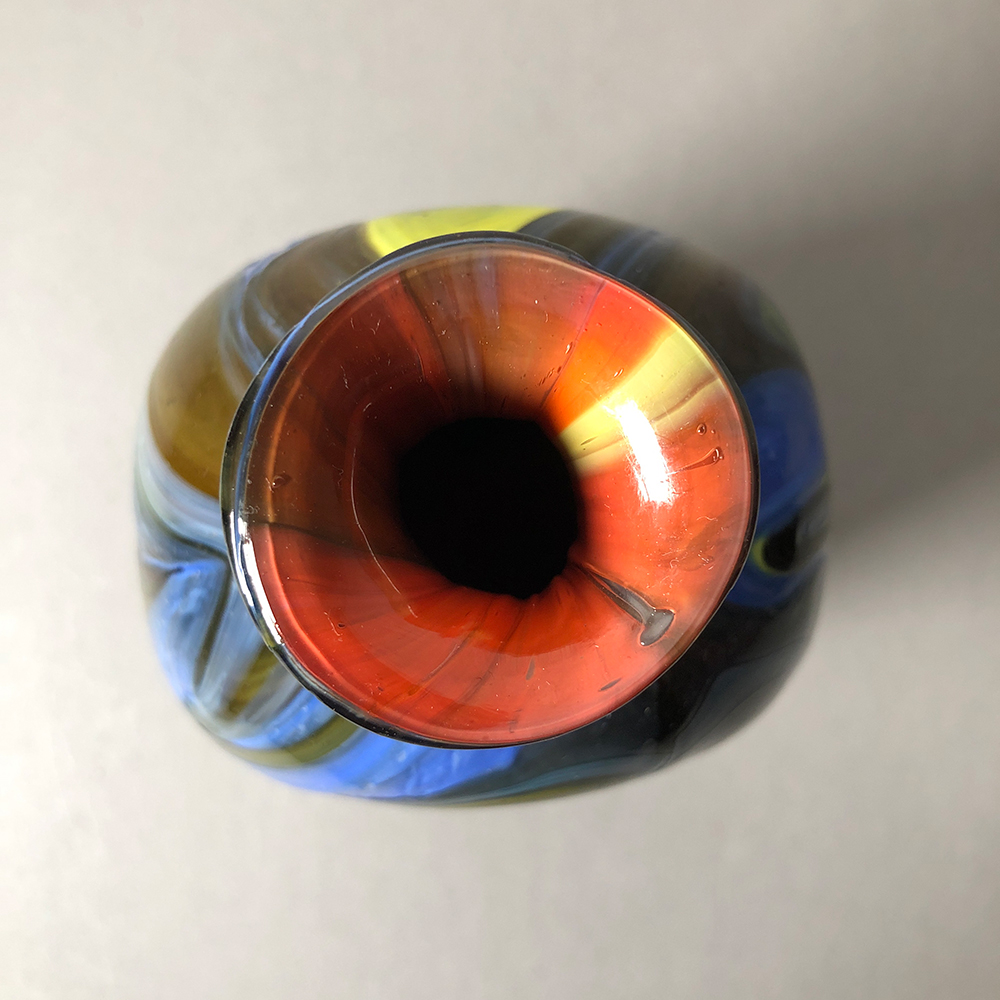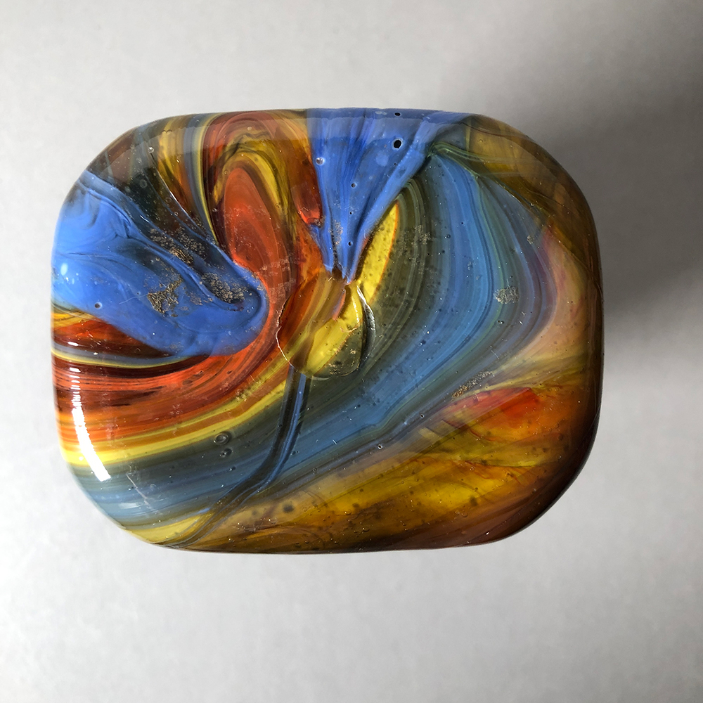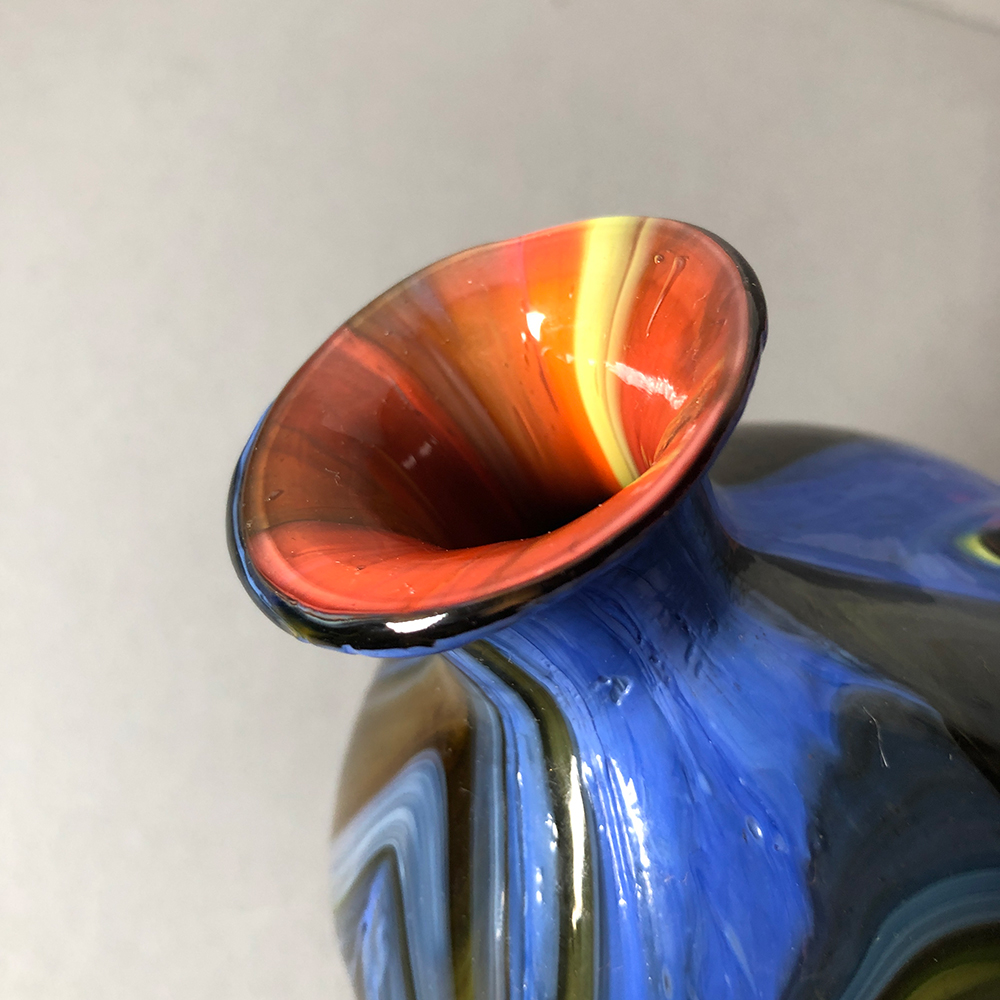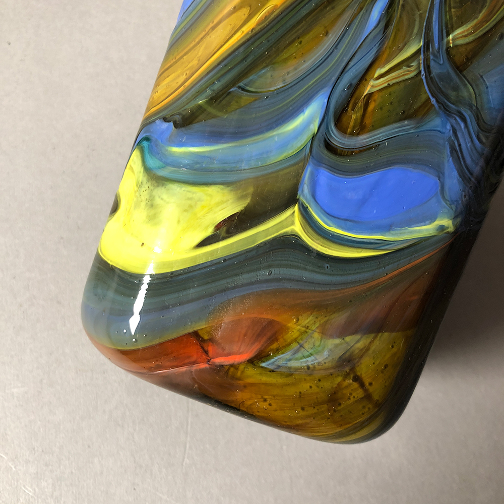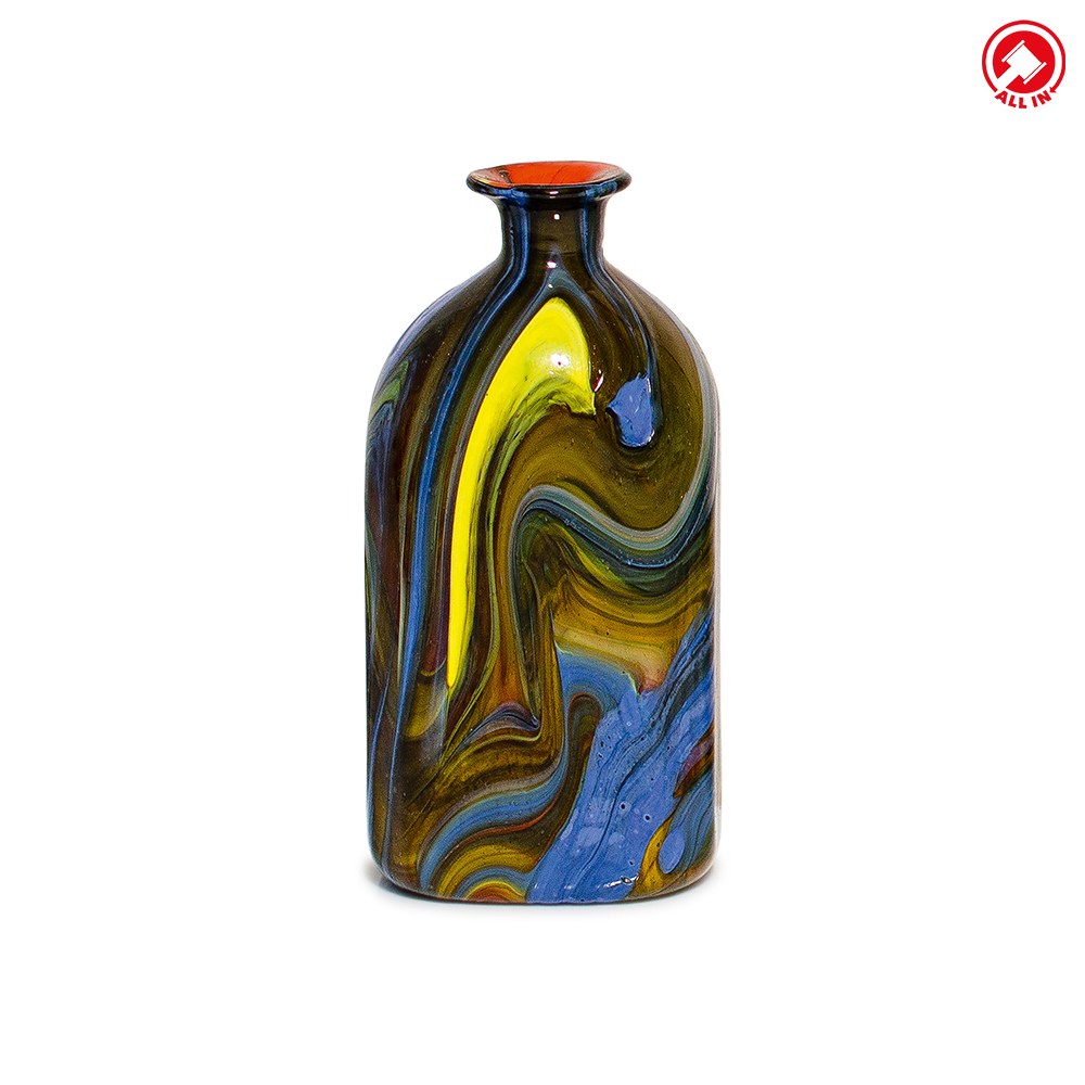 MANIFATTURA EUROPEA, Bottiglia in vetro policromo nei toni del marrone, del giallo e dell'azzurro, altezza cm 19,7.