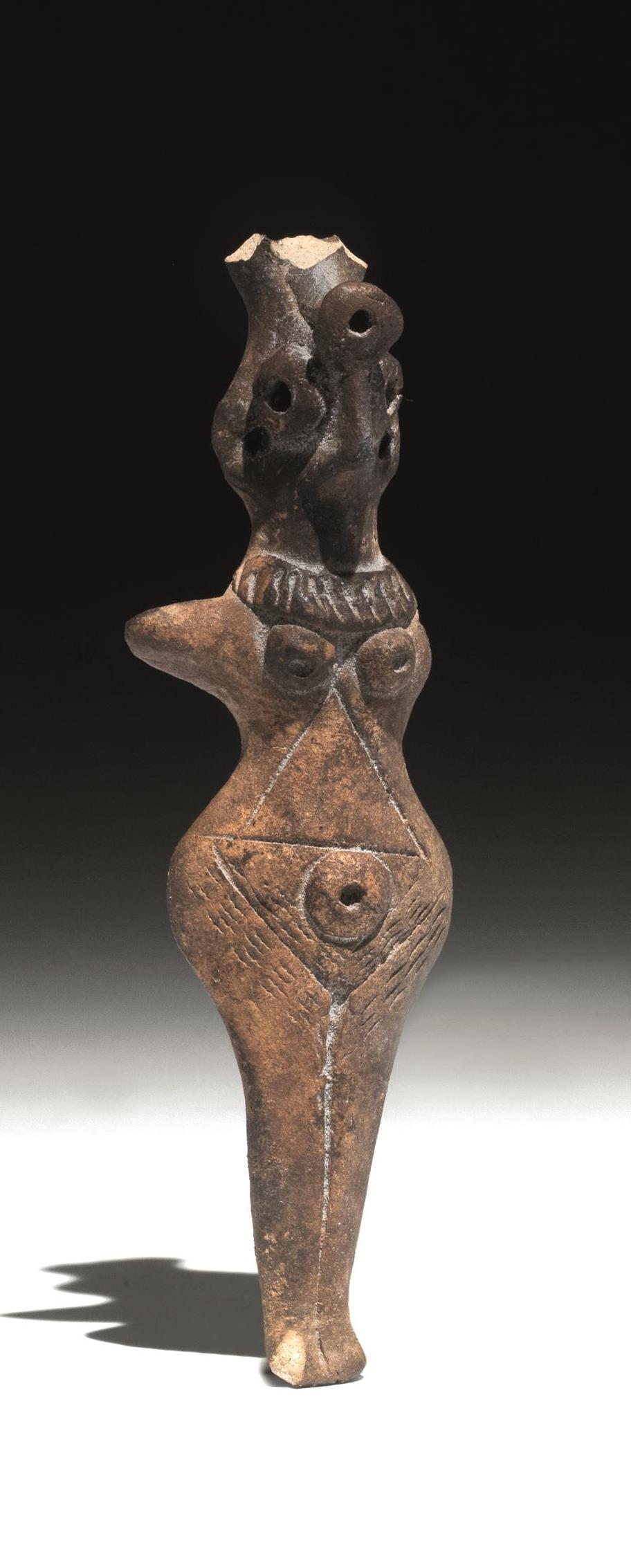 Statuetta raffigurante Dea Madre nuda con collana, testa stilizzata con becco di uccello, grandi occhi circolare, braccia divaricate, seni in rilievo, le notazioni anatomiche sono rese medianti sottili linee incise
