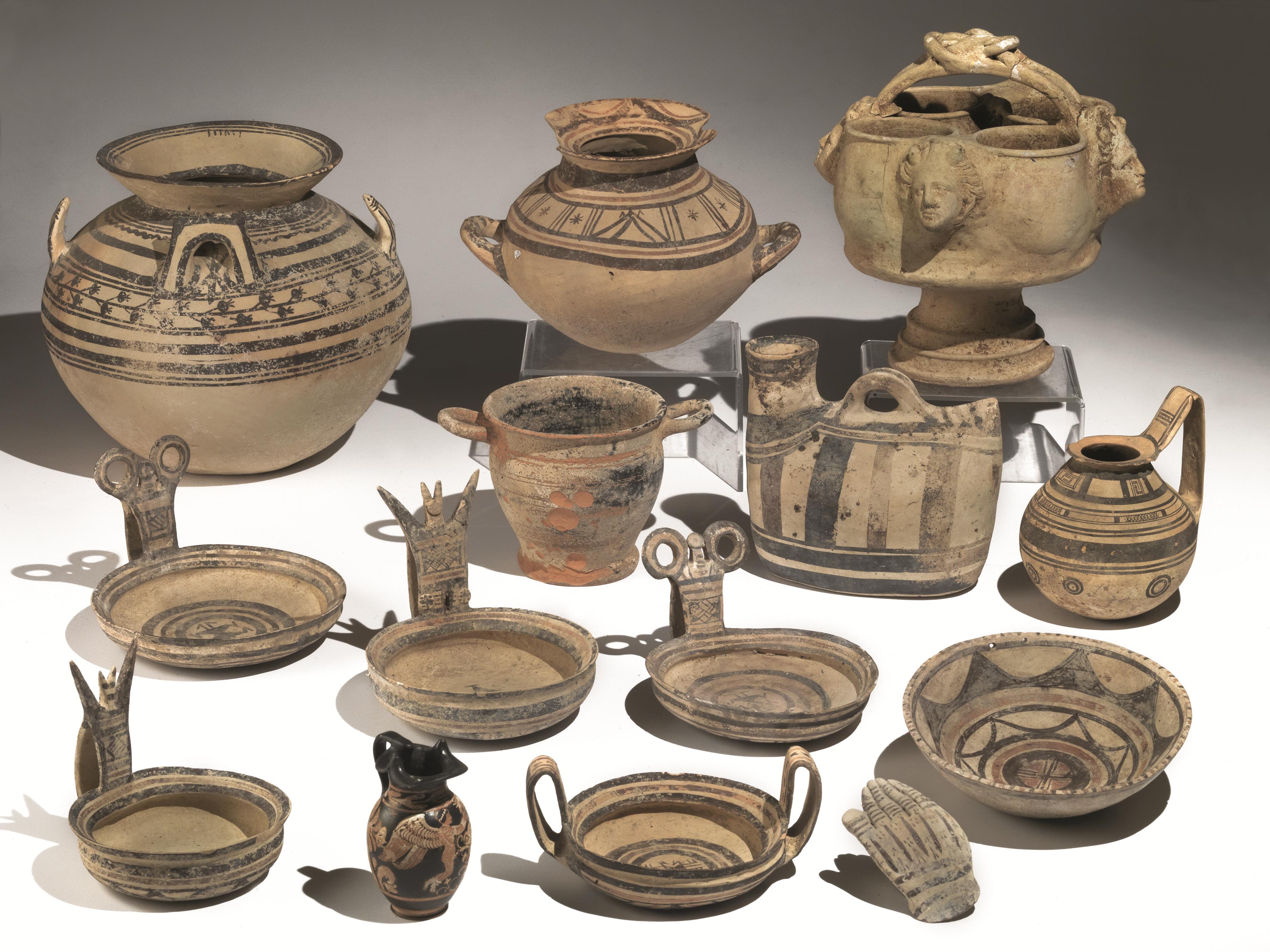 Ceramica daunia: due olle con bocca a imbuto, corpo globulare schiacciato ai poli, fondo piatto, decorate in bruno e paonazzo a motivi geometrici, una con anse a nastro impostate verticalmente sulla spalla alternate a protomi a forma di mano; due attingitoi monoansati con labbro svasato e bassa vasca troncoconica, fondo piatto e alta ansa a nastro con appendici cornute, decorati in bruno e paonazzo a motivi geometrici e con vasca centrata da motivo a uccello stilizzato, due altri attingitoi monoansati simili ma con anse a occhielli circolari decorati in modo analogo ai precedenti, un attingitoio biansato decorato in bruno e paonazzo con motivi analoghi agli altri attingitoi, un askos in forma di otre stilizzata decorato a fasce in bruno e paonazzo, una coppa troncoconica a fondo piatto decorata in bruno e paonazzo con cerchi e archi tangenti, una brocca con labbro orizzontale corpo piriforme e fondo piatto, ansa a nastro verticale e sormontante decorata in bruno a motivi geometrici e una mano destra proveniente da un’olla di grandi dimensioni,
