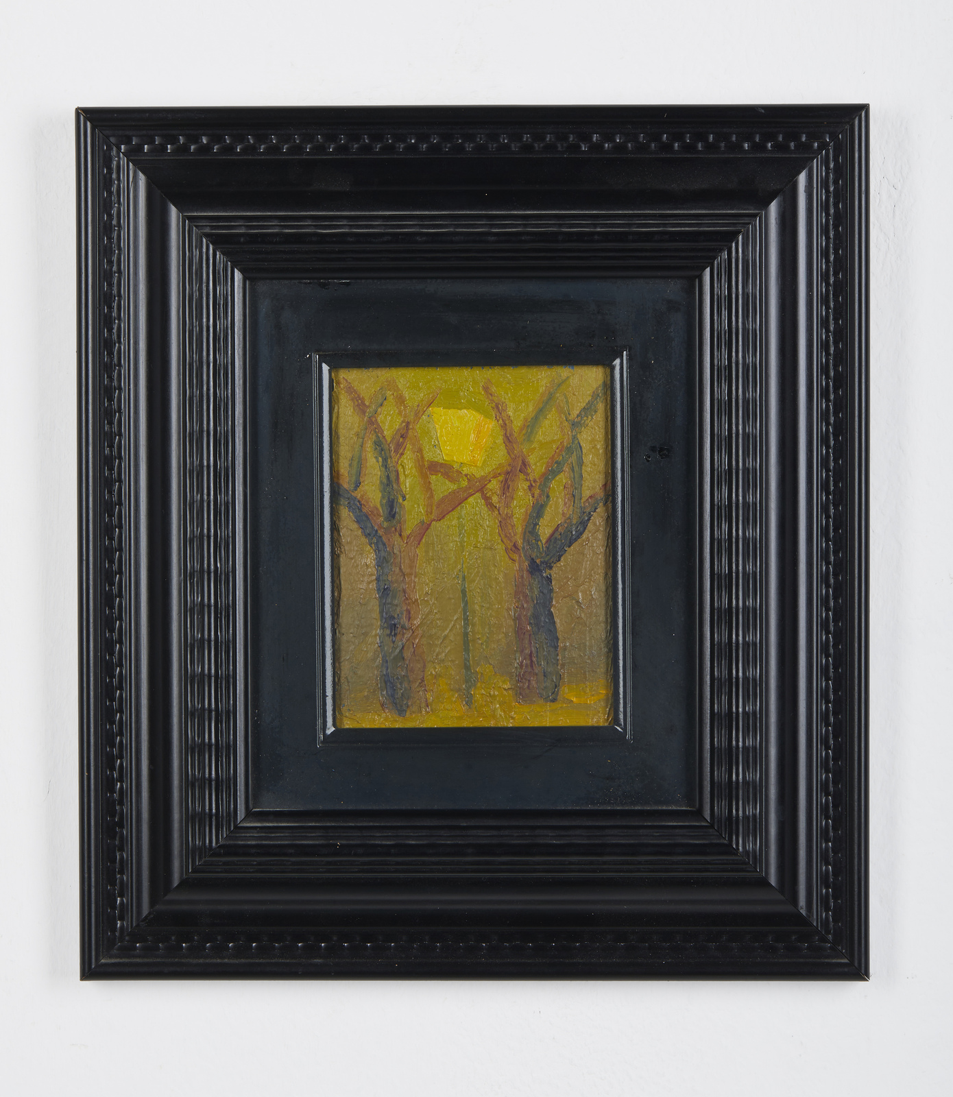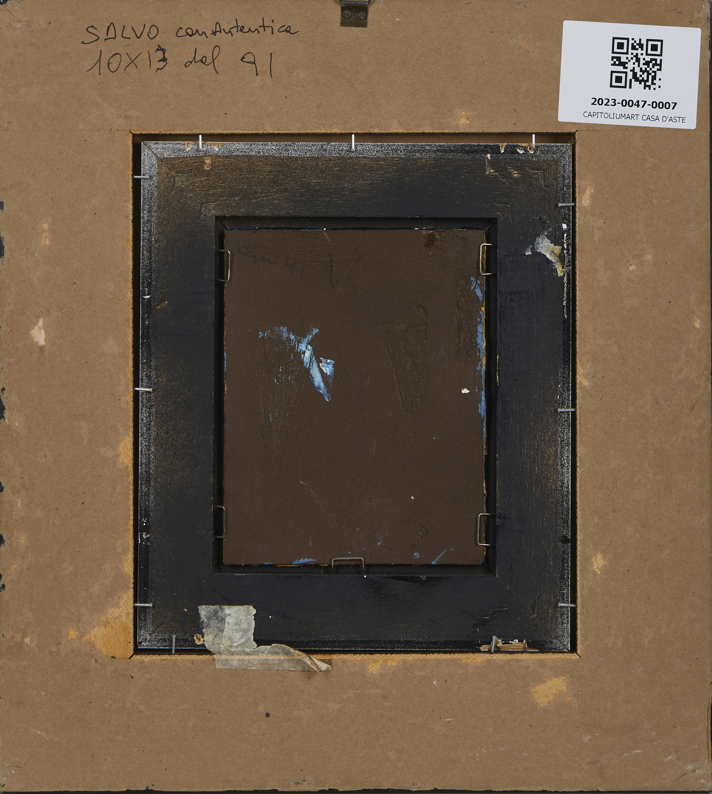 SALVO (SALVATORE MANGIONE) (1947 - 2015) Senza titolo. 1991. Olio su linoleum. Cm 10,00 x 13,00. Al retro firma e anno. Autentica dell'artista su fotografia. Opera archiviata presso l'Archivio Salvo, Torino, come da documentazione fotografica allegata all'opera riportante il relativo numero d'inventario. Cornice presente