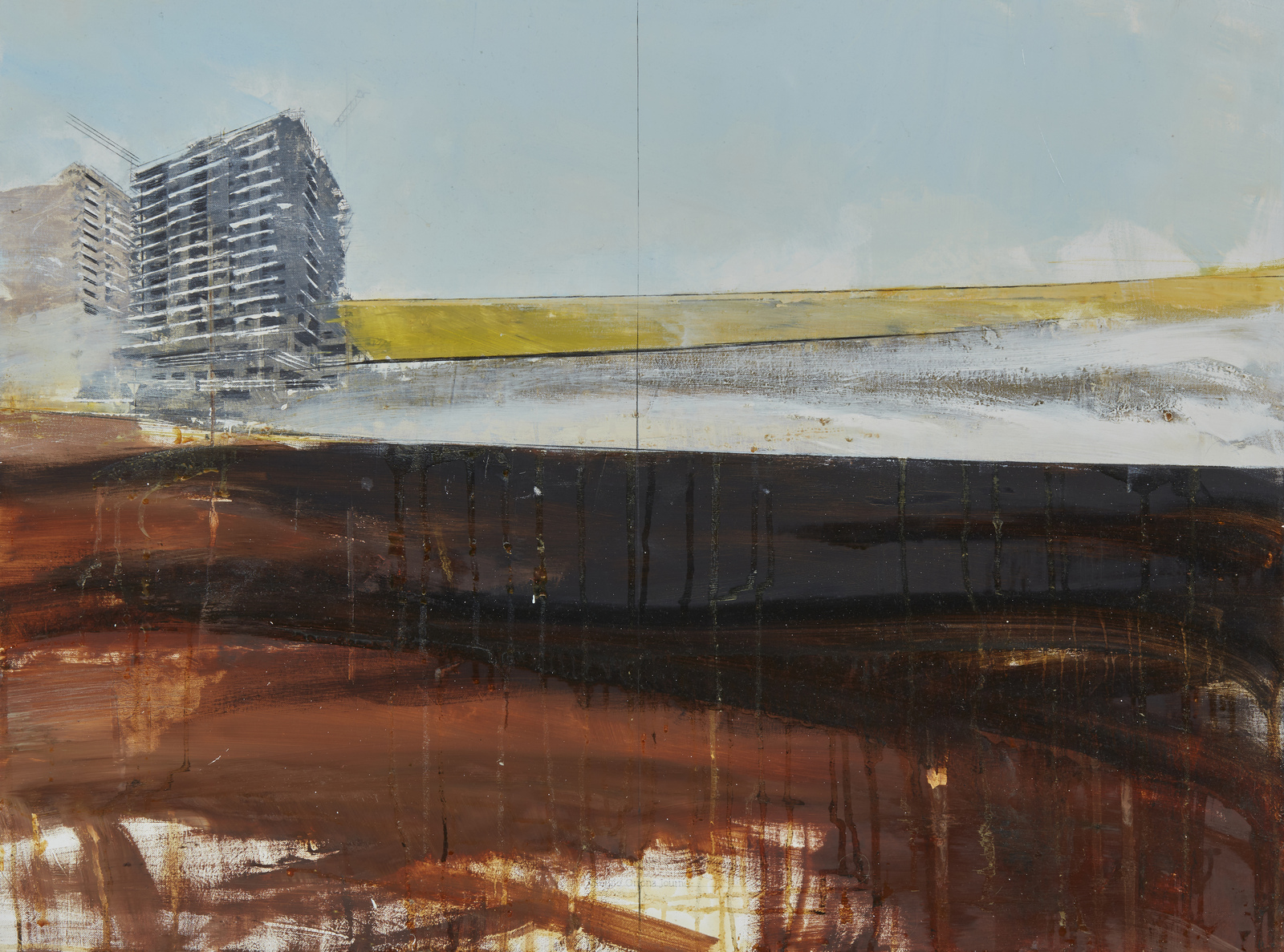 ORTONA GIORGIO (n. 1960) Cantiere di Cosenza. 2012. Olio su tela . Cm 80,00 x 60,00. Firma in basso al centro e al retro. Autentica dell'artista su fotografia (copia). Provenienza: D.L. Arte, Milano; Collezione privata, Novara. . Cornice presente